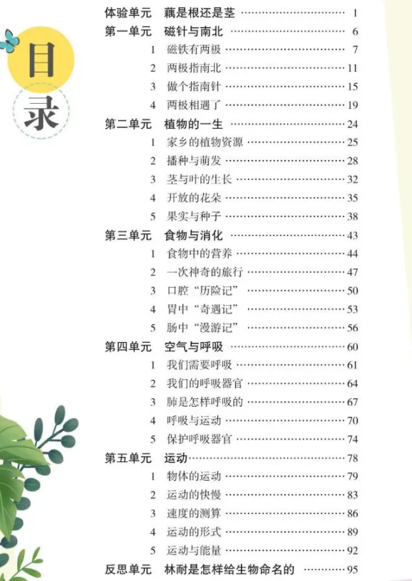 2.主题单元:涵盖《磁针与南北》《植物的一生》《食物与消化》《空气与呼吸》《运动》五大主题,分别从磁现象、植物生长、人体消化、人体呼吸、物体运动五个领域,让学生在探究中形成磁极、植物六大器官、消化器官、呼吸器官、运动形式等核心科学概念,培养探究实践能力。
