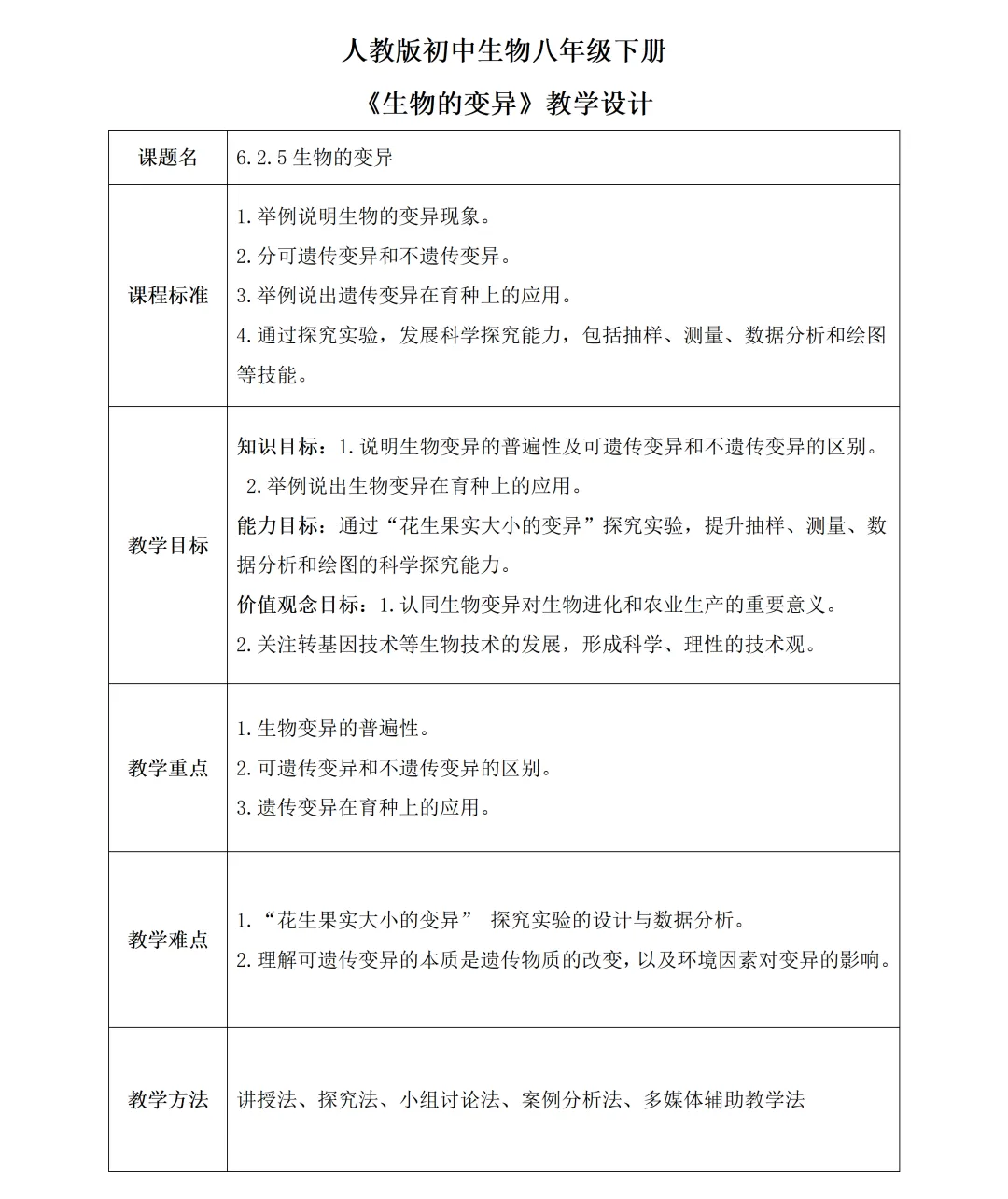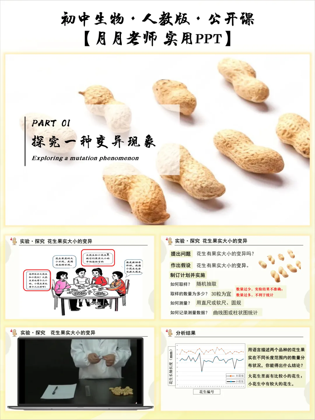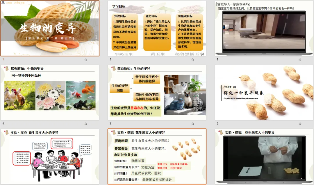“花生果实大小的变异” 探究实验是本节课的核心,这份设计没有简化实验流程,而是让学生体验 “提出问题→作出假设→设计方案→数据分析→得出结论”的完整科学探究过程。从强调随机抽样、规范测量的操作要点,到指导用图表统计数据、计算平均值,再到引导分析 “大花生有小个、小花生有大个” 的现象,每一步都层层递进。