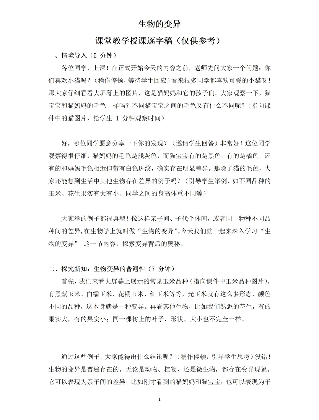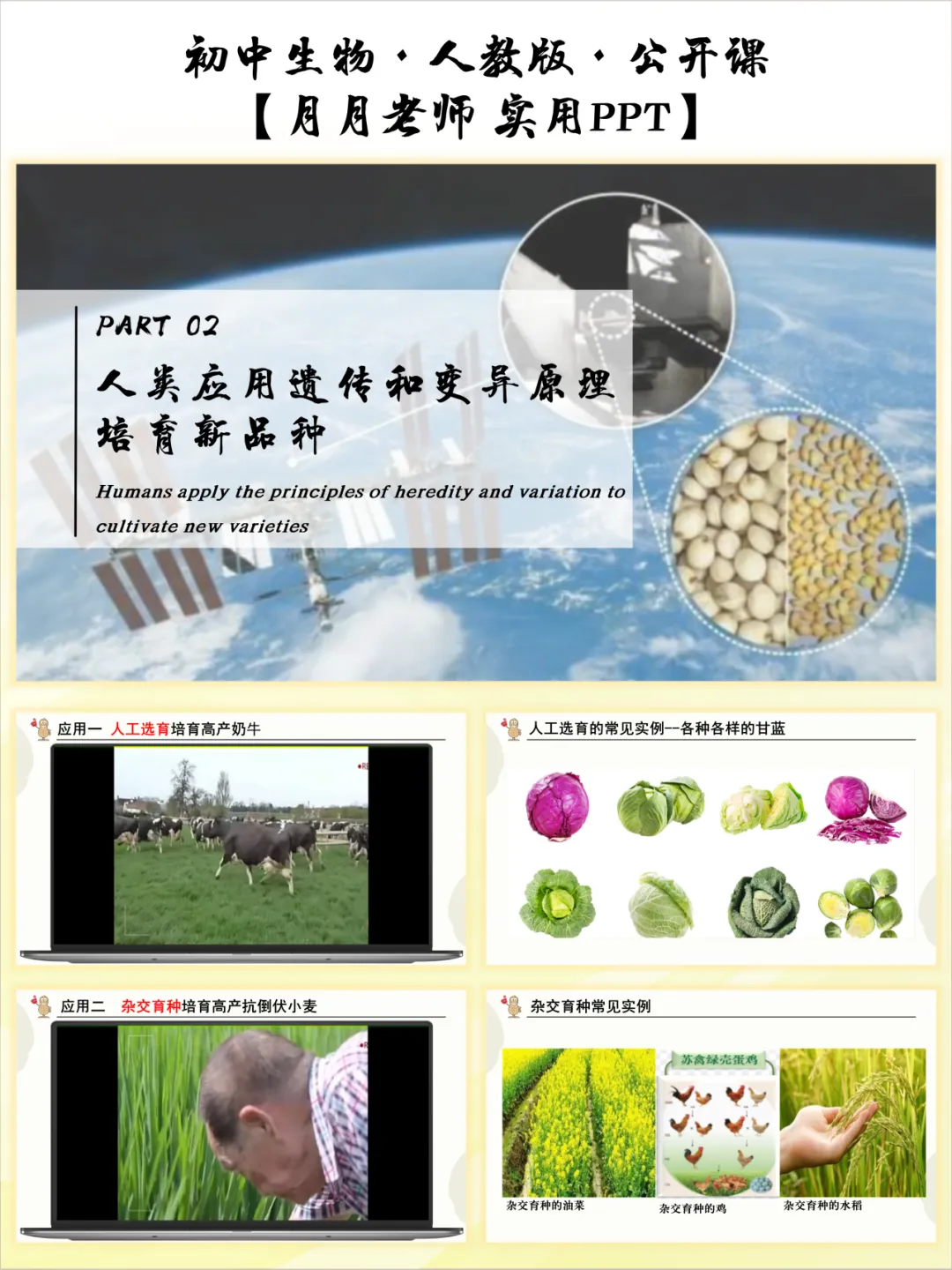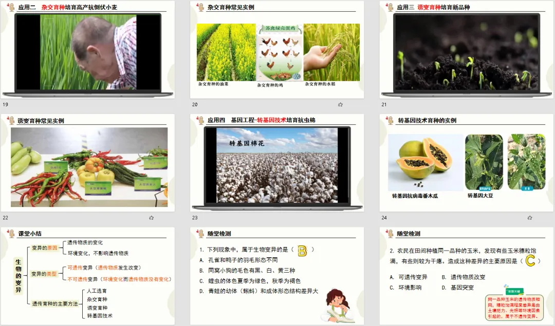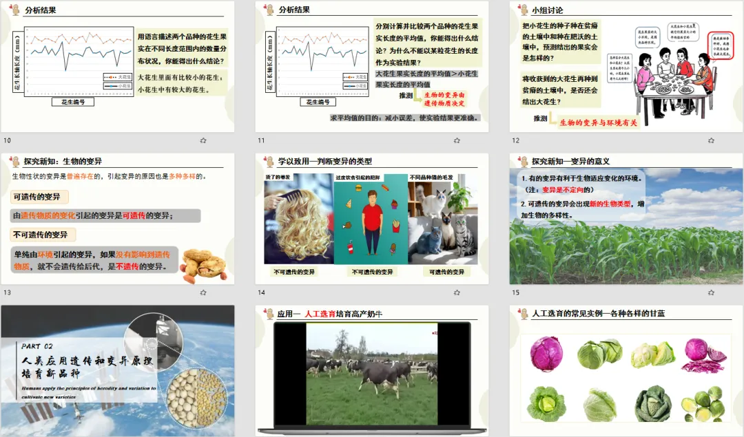 生物知识的魅力,就在于能解释生活、服务生产!这份设计把 “变异” 的知识点从课堂延伸到生活和农业生产,做到了“从生活中来,到生活中去”。先引导学生讨论变异对生物自身的意义,理解变异为生物进化提供原材料、帮助生物适应环境;再展示人工选育、杂交育种、诱变育种、转基因技术的实例,从高产奶牛、杂交水稻到太空椒、抗虫棉,结合提问分析每种育种方法的原理和优点。