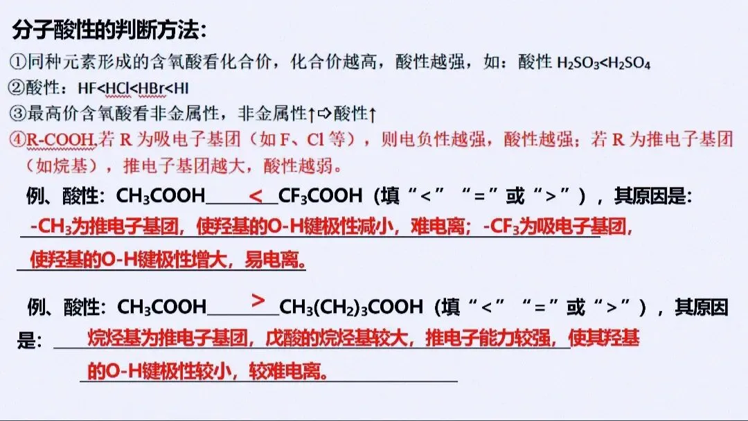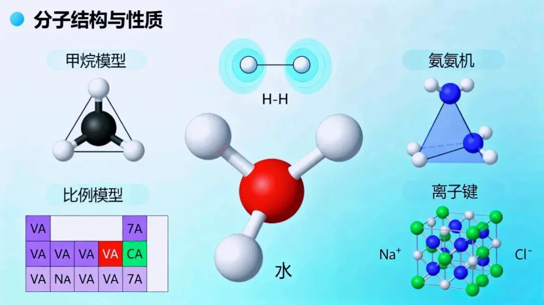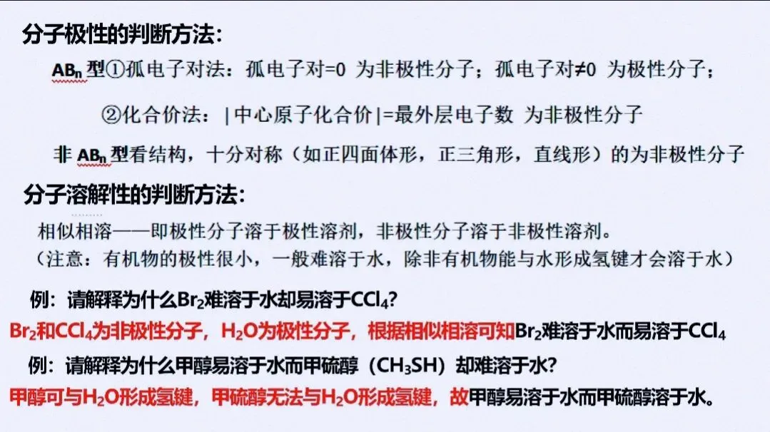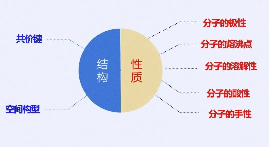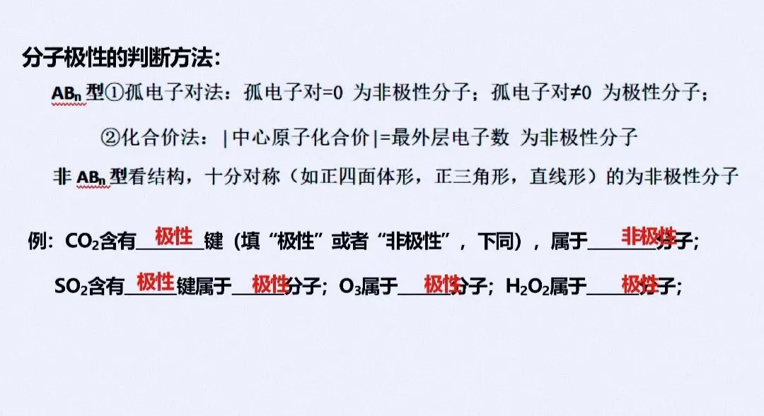 (2) 分子的极性判断:根据分子的空间构型以及键的极性来判断分子是否为极性分子,如直线形的CO₂是非极性分子,V形的H₂O是极性分子。
