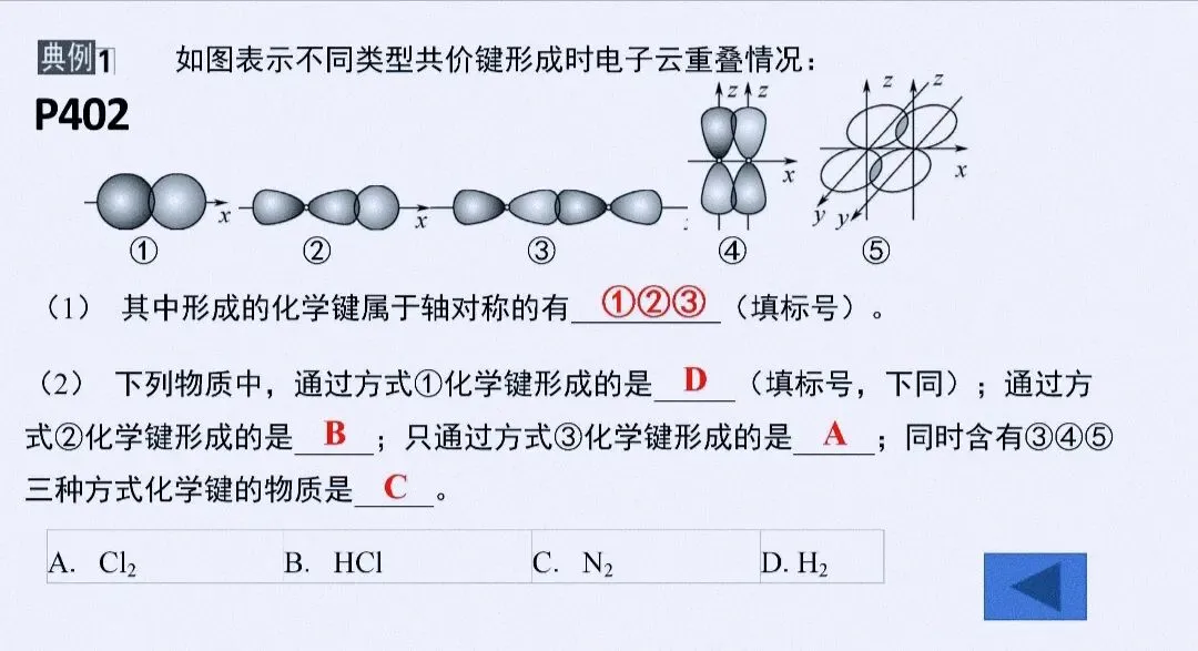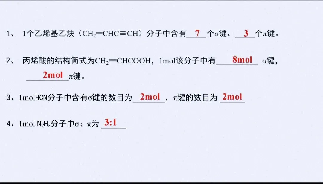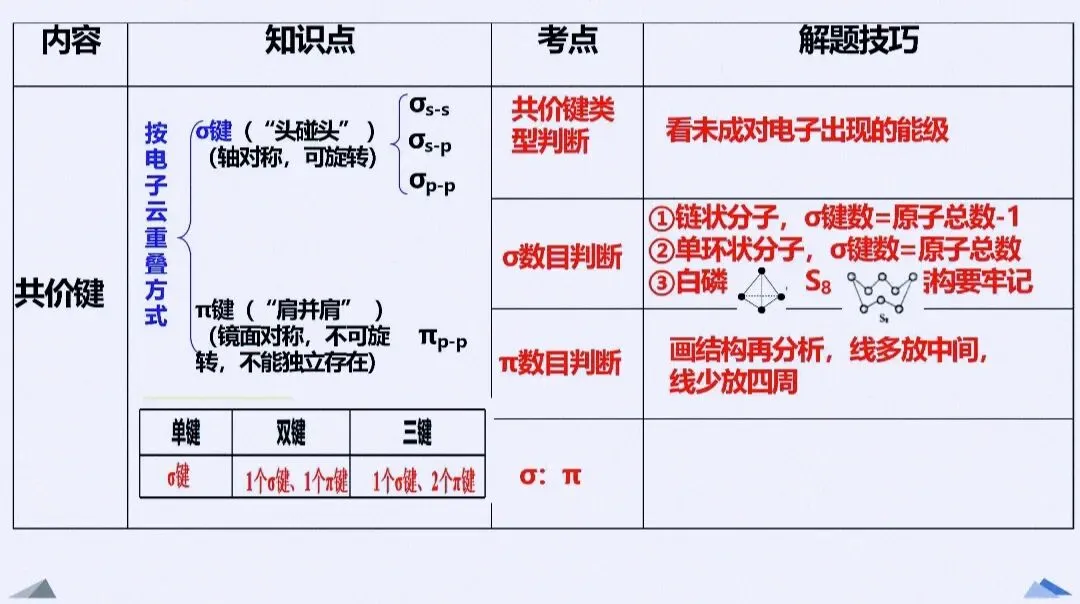 (4) 共价键的类型:判断共价键是σ键还是π键,以及极性键和非极性键。如共价单键是σ键,共价双键中含有一个σ键和一个π键,不同种元素原子间形成极性键,同种元素原子间形成非极性键。