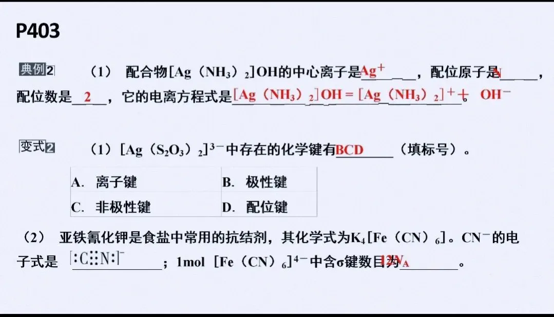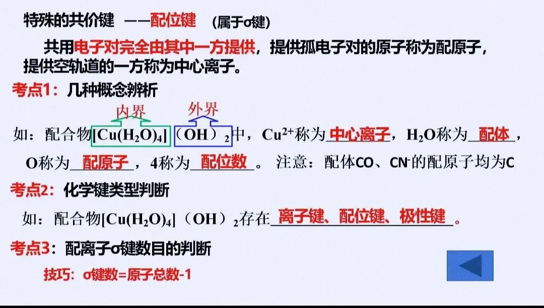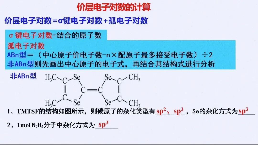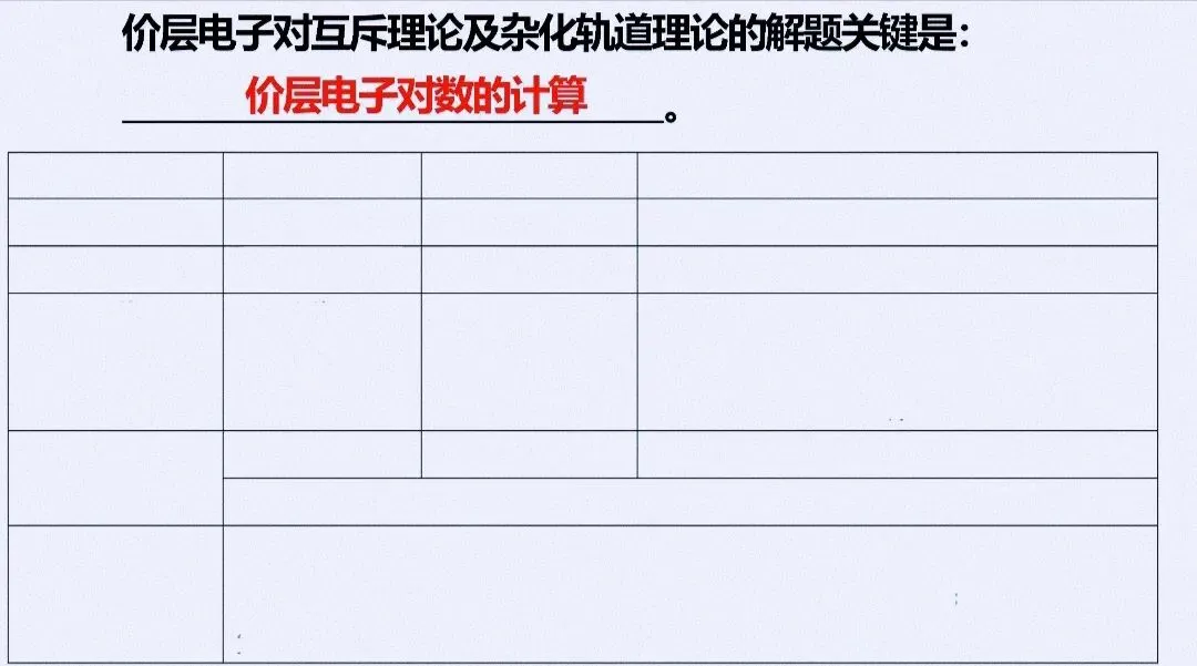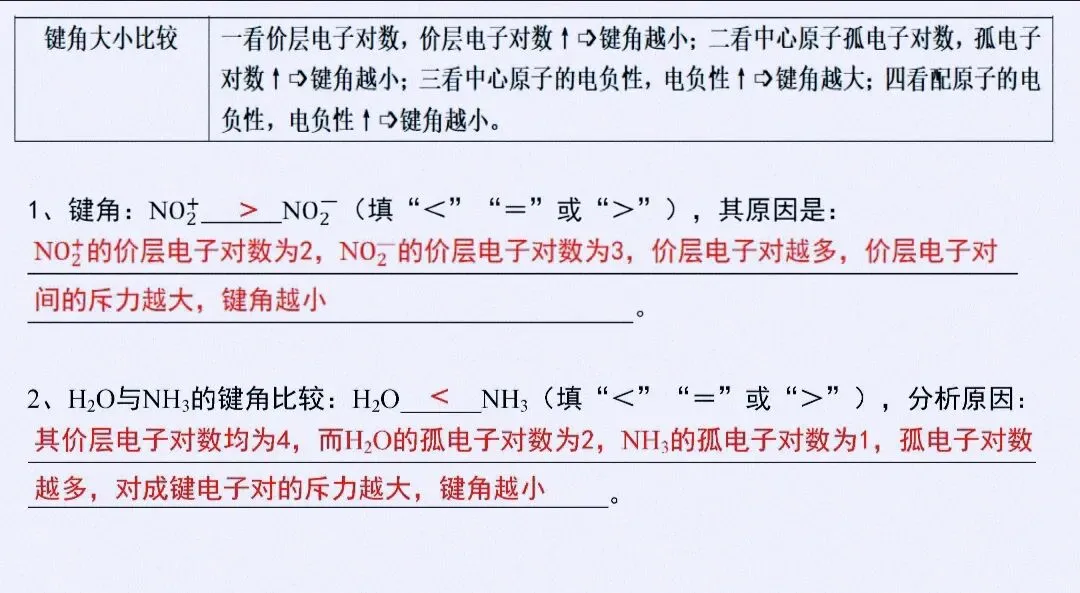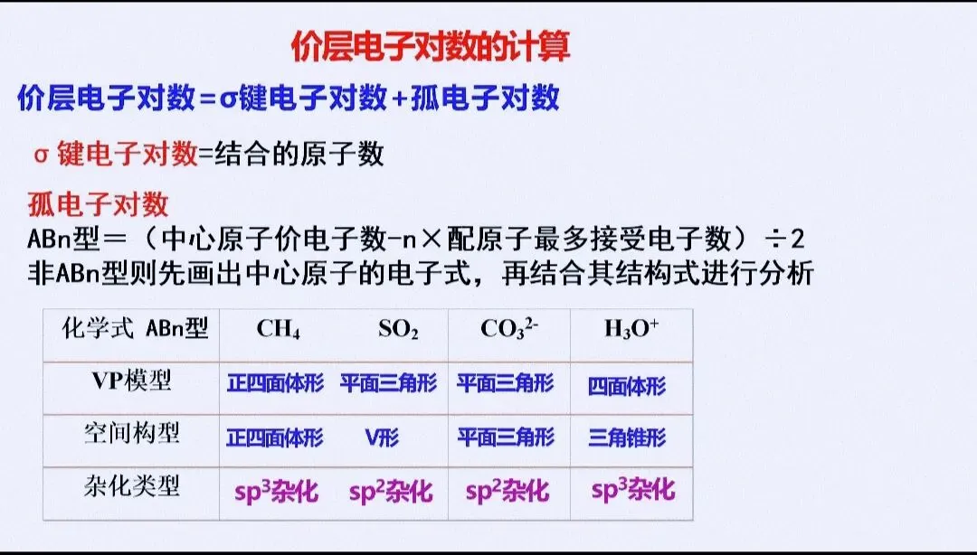 (1)价层电子对互斥理论与杂化轨道理论:利用价层电子对互斥理论推测分子或离子的立体构型,根据中心原子的价层电子对数判断杂化方式,如中心原子价层电子对数为4是sp³杂化,为3是sp²杂化,为2是sp杂化。这部分常结合具体分子或离子进行考查,如NH₃、H₂O、CO₂等。