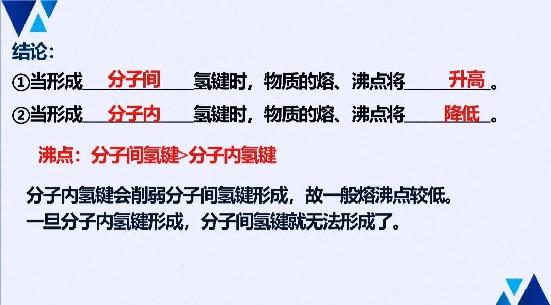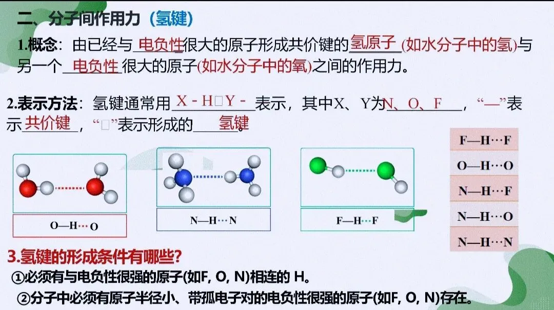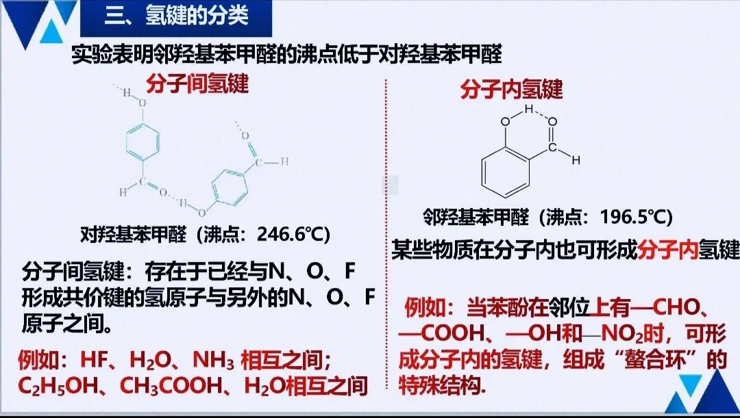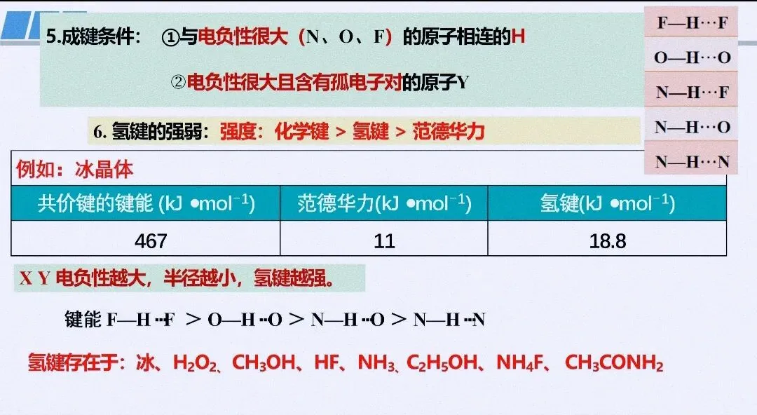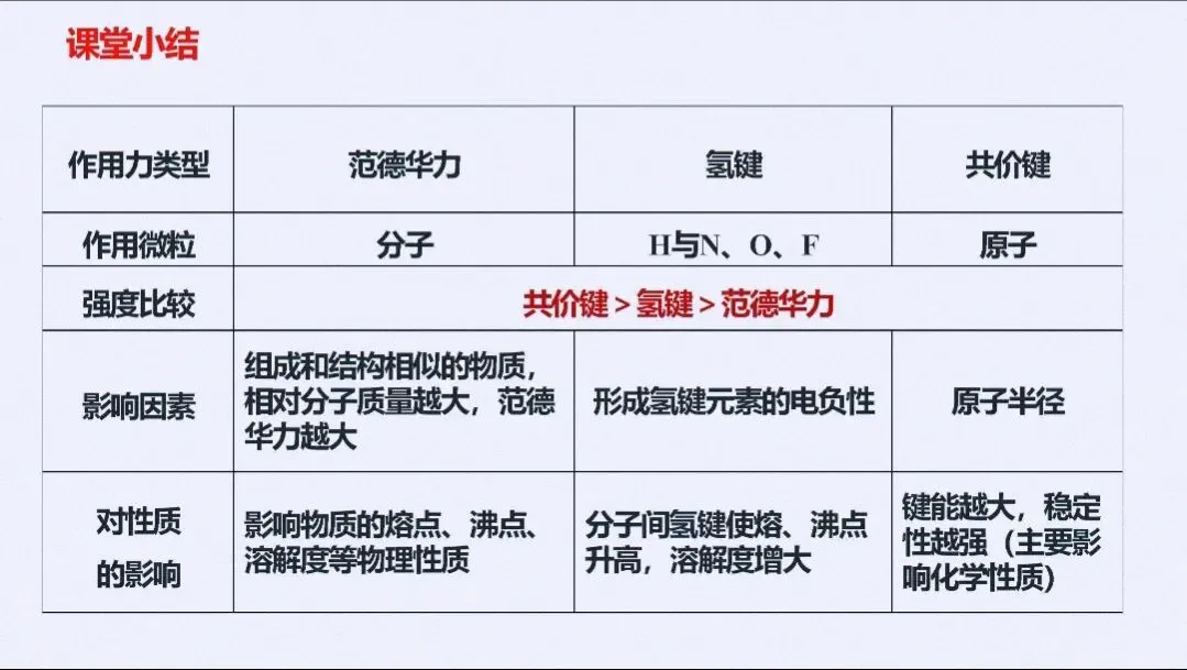 - 关键考法:判断氢键形成条件(N/O/F与H)、区分分子内/分子间氢键对性质的不同影响,对比范德华力、氢键、化学键的强度差异。