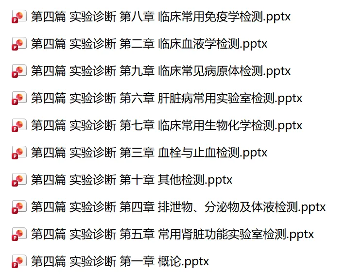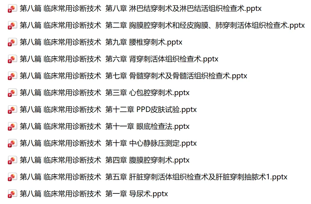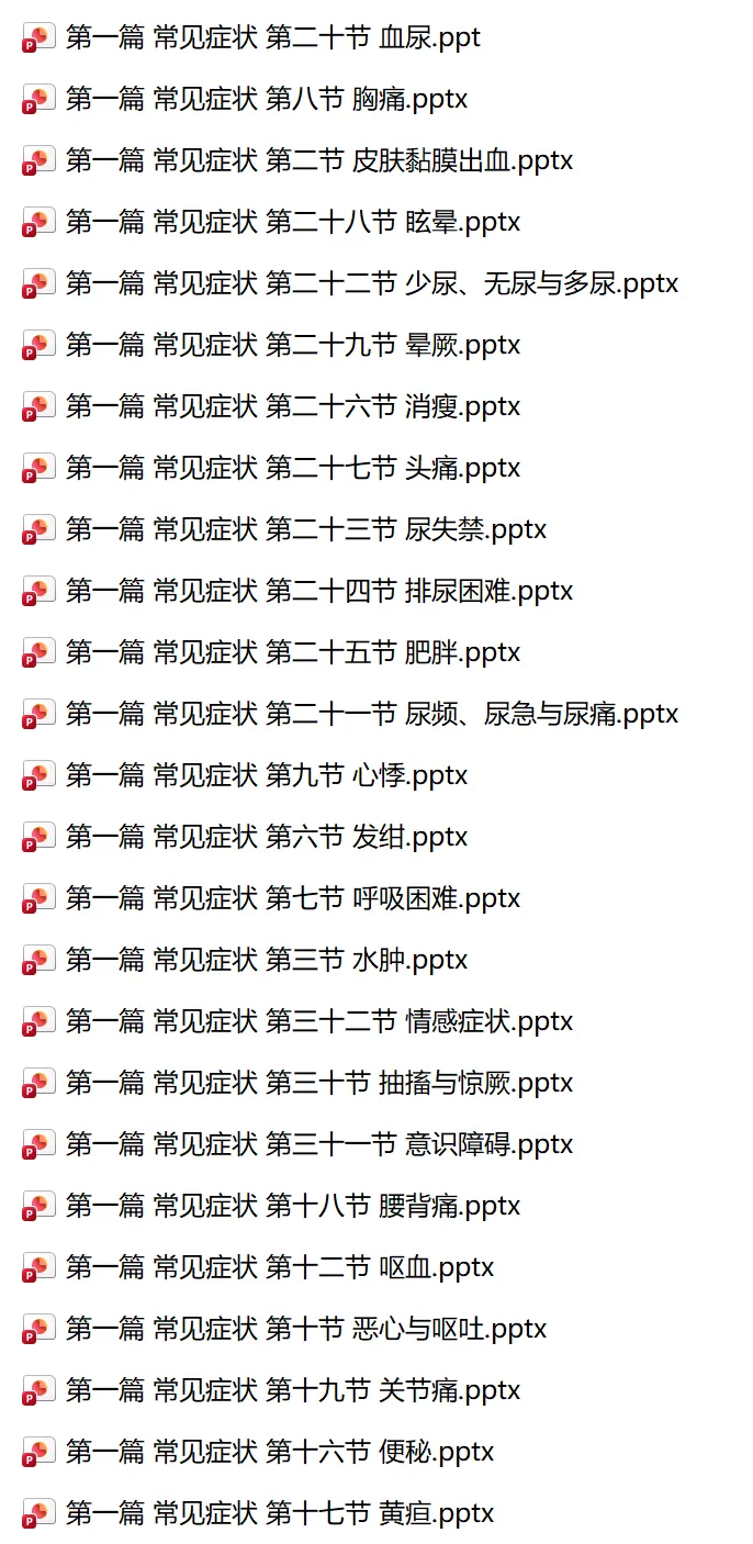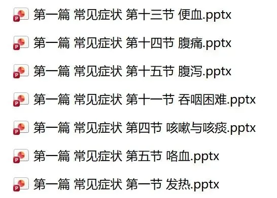 这次给各位老师带来一整套关于大学诊断学相关的教学课件,总共分为8章,共85个课件,每个章节都有详细的内容分类,每个课件都有完整的框架大纲和目录结构。有从事医护类专业教学的老师,医护相关专业的同学,都可以拿来参考借鉴一下,具体的章节目录如下:第一篇--常见症状 32个章节