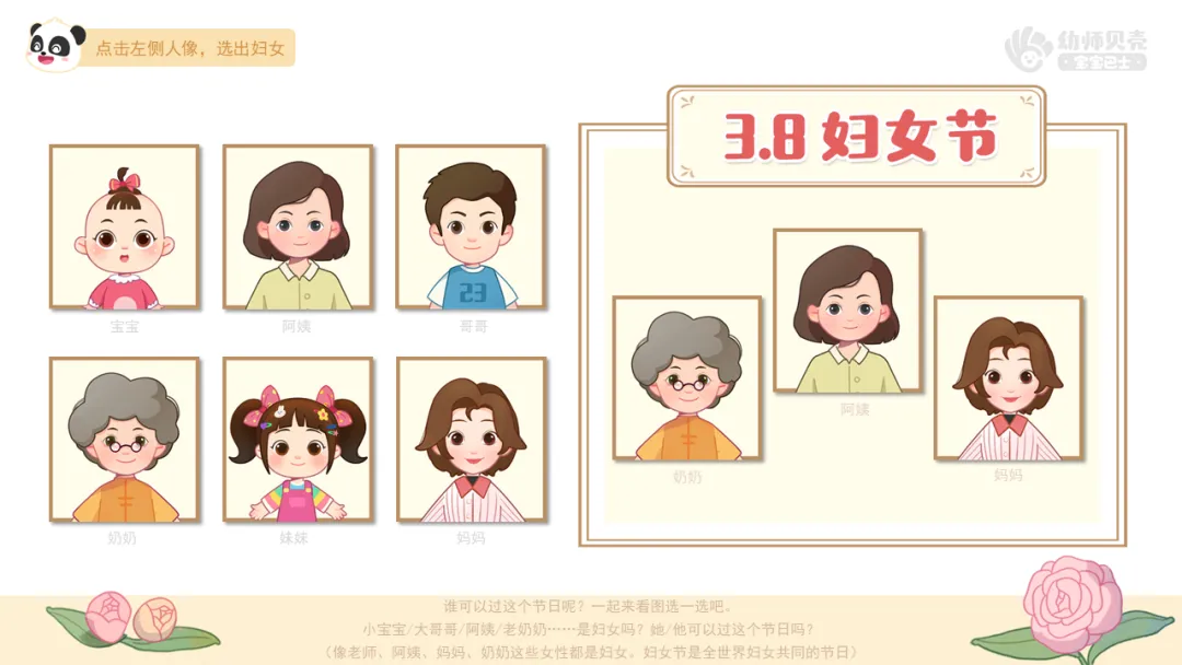 ——每年的3月8日是国际劳动妇女节。谁可以过这个节日呢?一起来看图选一选吧。