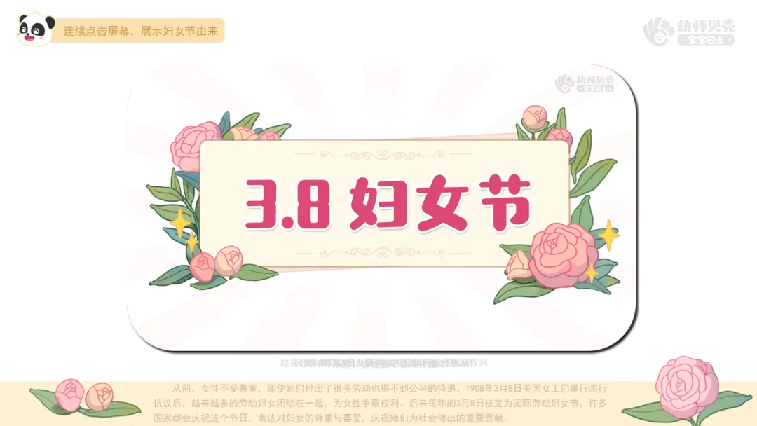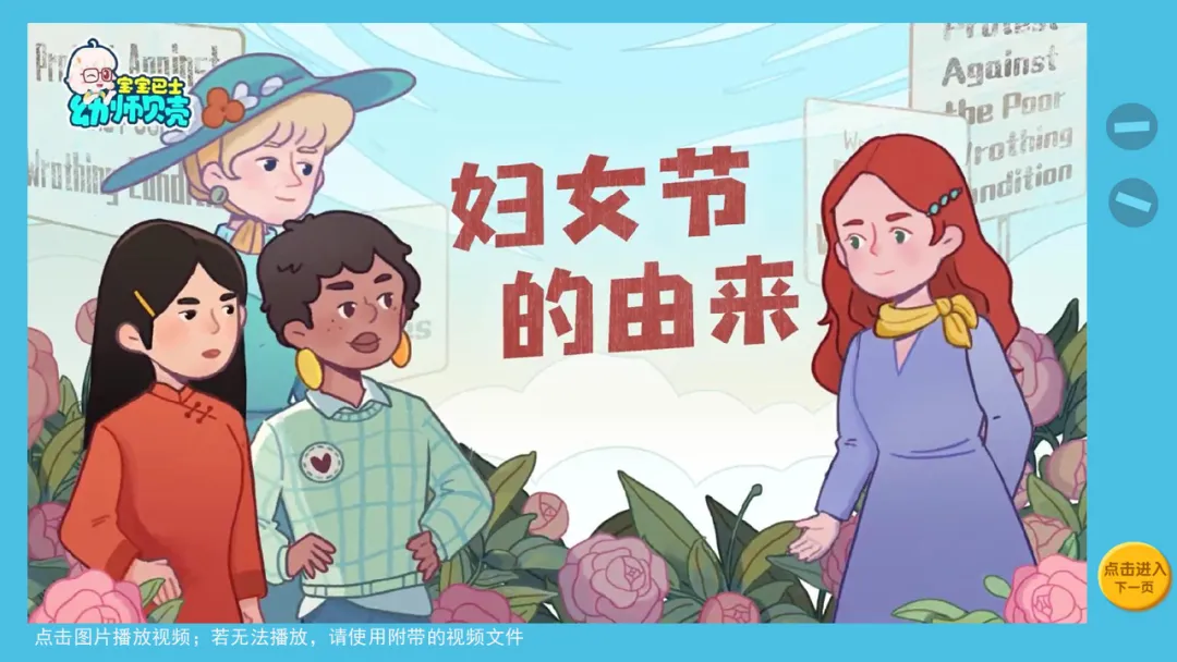 l播放故事视频及组图《妇女节的由来》,引导幼儿初步了解妇女节的由来。