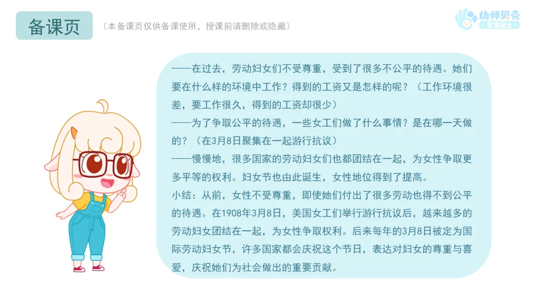 小结:从前,女性不受尊重,即使她们付出了很多劳动也得不到公平的待遇。在1908年3月8日,美国女工们举行游行抗议后,越来越多的劳动妇女团结在一起,为女性争取权利。后来每年的3月8日被定为国际劳动妇女节,许多国家都会庆祝这个节日,表达对妇女的尊重与喜爱,庆祝她们为社会做出的重要贡献。