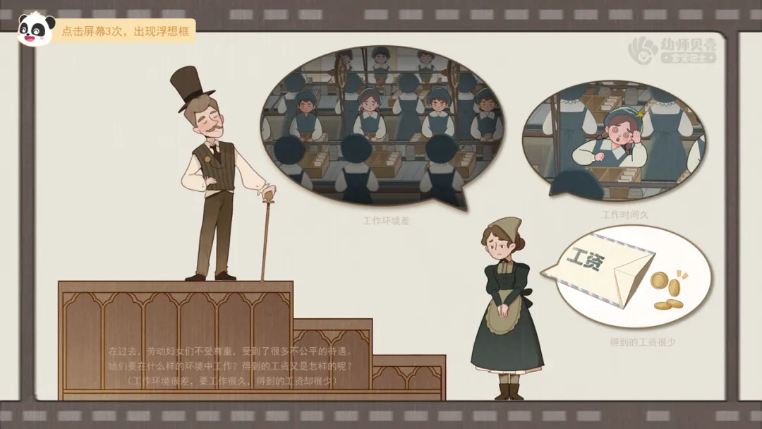 ——在过去,劳动妇女们不受尊重,受到了很多不公平的待遇。她们要在什么样的环境中工作?得到的工资又是怎样的呢?(工作环境很差,要工作很久,得到的工资却很少)