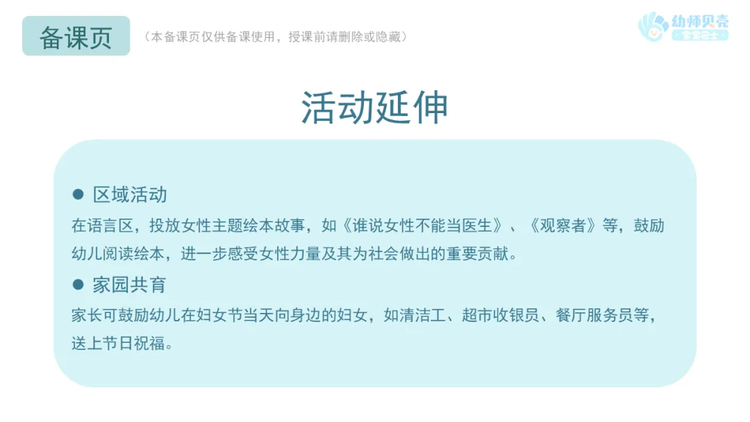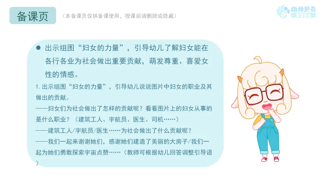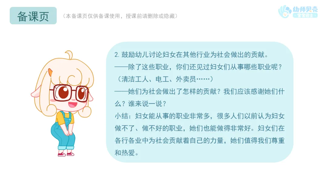2.鼓励幼儿讨论妇女在其他行业为社会做出的贡献。