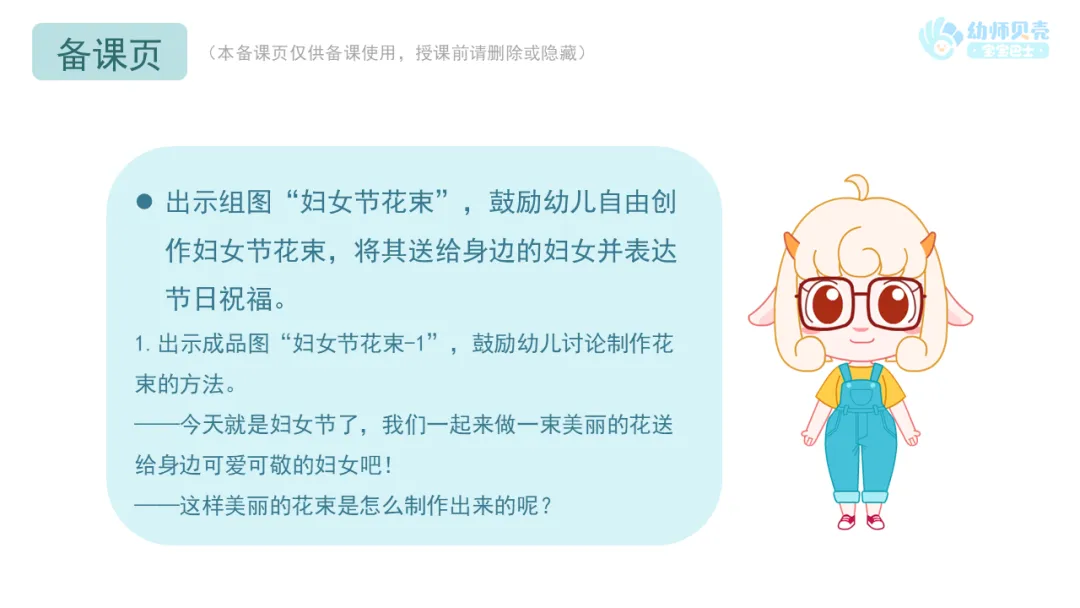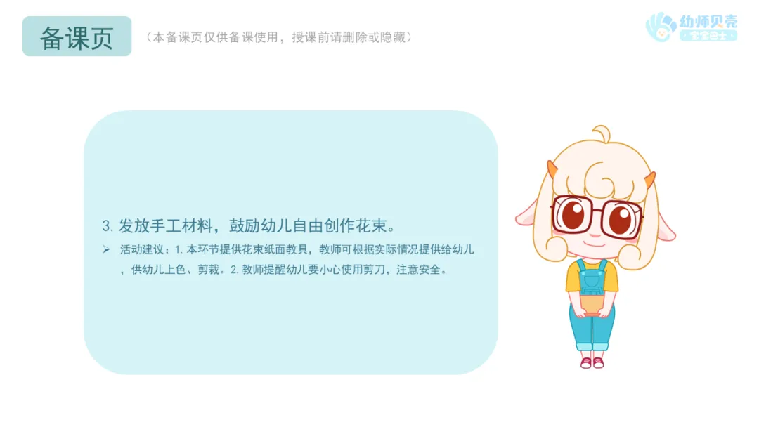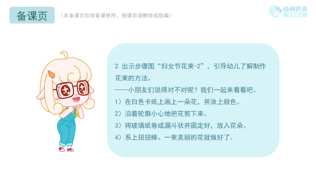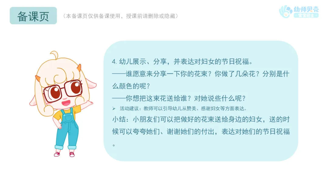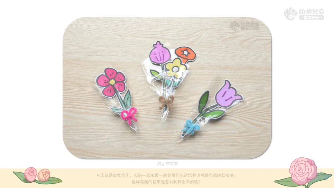 小结:小朋友们可以把做好的花束送给身边的妇女,送的时候可以夸夸她们、谢谢她们的付出,表达对她们的节日祝福。