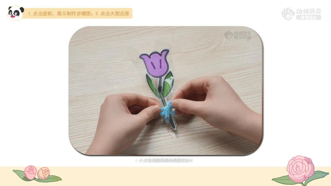 2.出示步骤图“妇女节花束-2”,引导幼儿了解制作花束的方法。