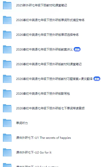 本文收集的教学资源是2026春新外研版七年级语文下册下册课件教案同步练习作业本必刷题教材习题答案单词课文翻译朗读音频笔记闪卡默写试卷重点知识教辅最新优质资源,全部存放于网盘,网盘部分资源截图如下: