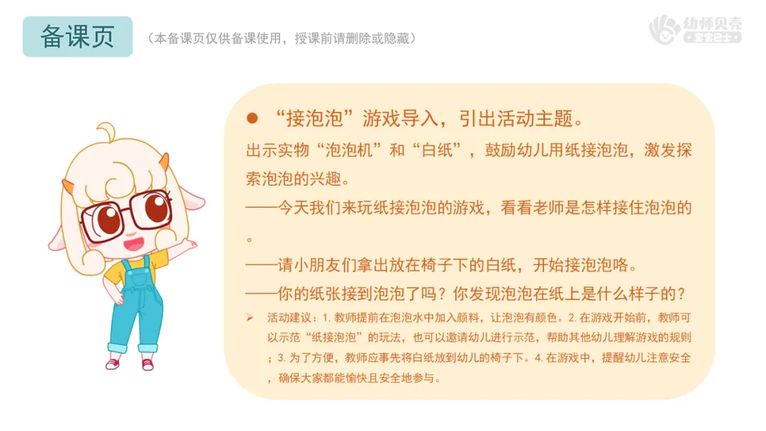 Ø活动建议:1.教师提前在泡泡水中加入颜料,让泡泡有颜色。2.在游戏开始前,教师可以示范“纸接泡泡”的玩法,也可以邀请幼儿进行示范,帮助其他幼儿理解游戏的规则;3.为了方便,教师应事先将白纸放到幼儿的椅子下。4.在游戏中,提醒幼儿注意安全,确保大家都能愉快且安全地参与。