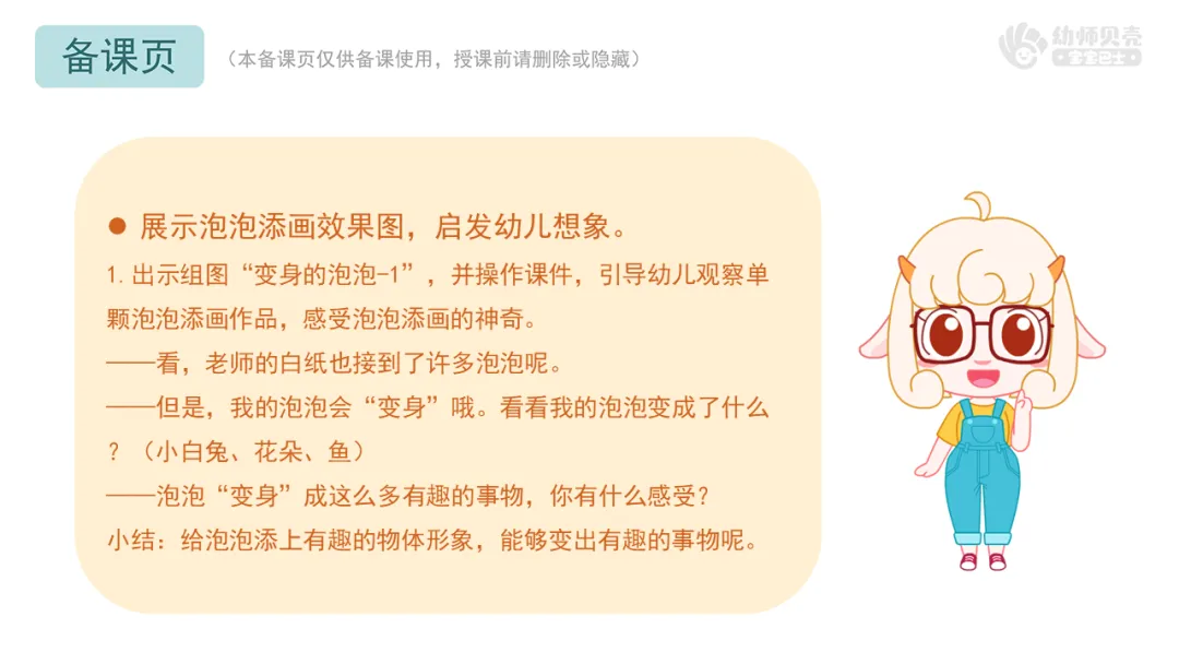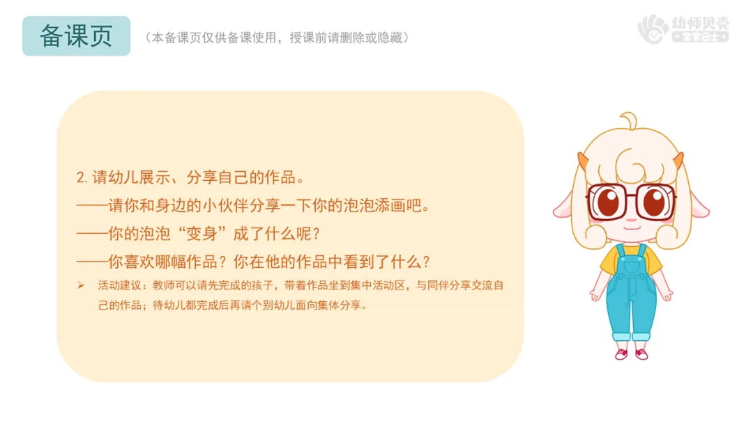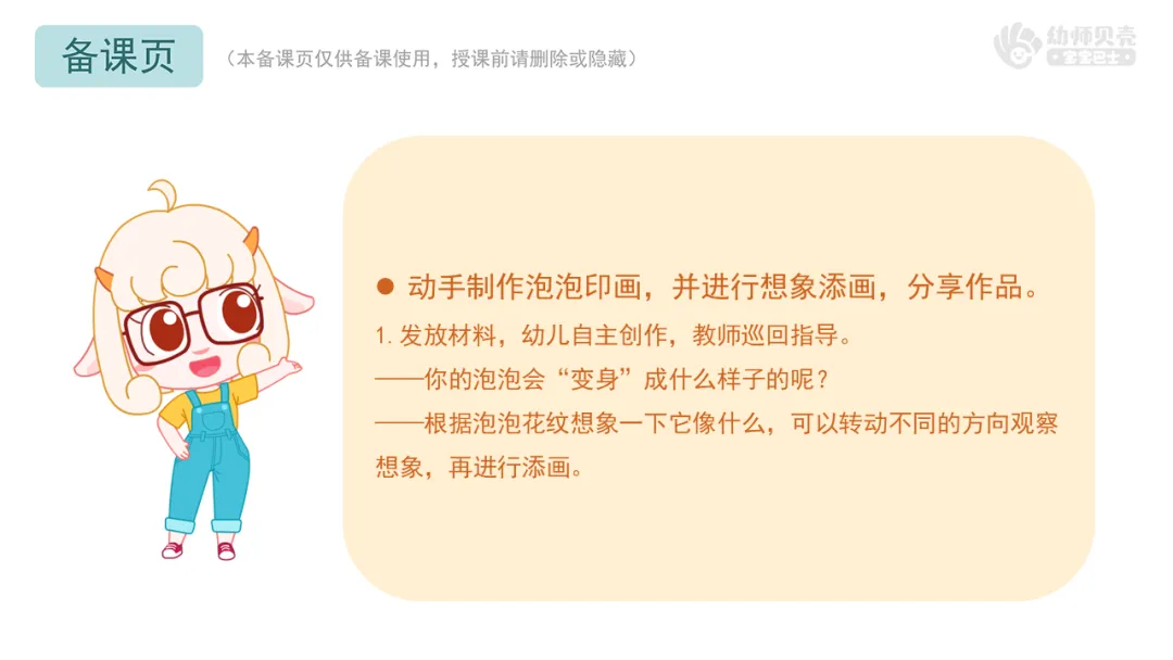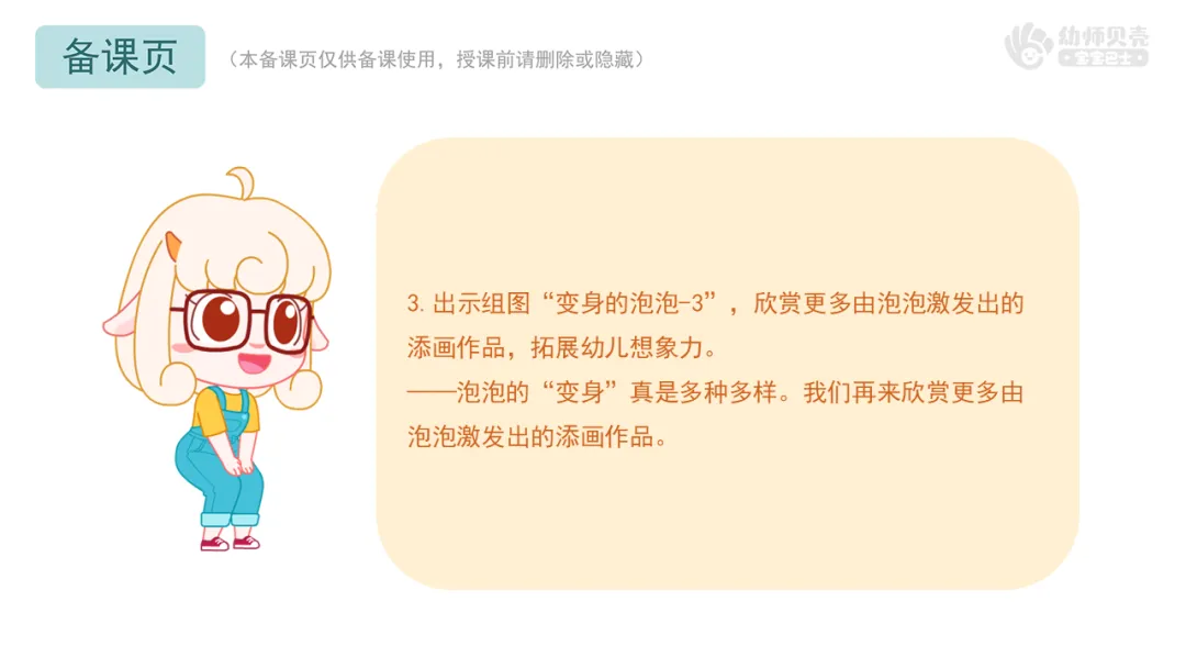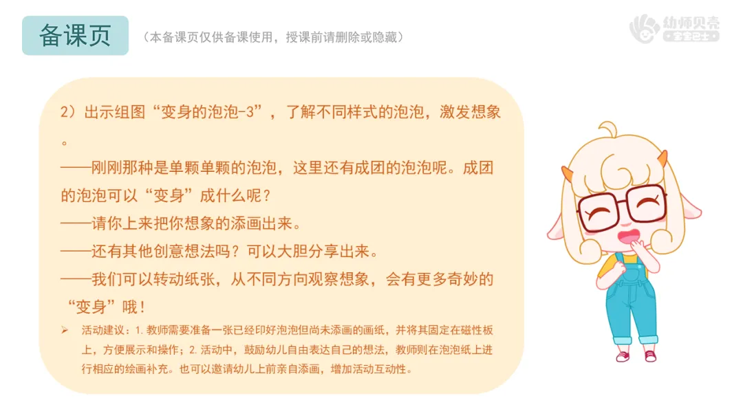 Ø活动建议:1.教师需要准备一张已经印好泡泡但尚未添画的画纸,并将其固定在磁性板上,方便展示和操作;2.活动中,鼓励幼儿自由表达自己的想法,教师则在泡泡纸上进行相应的绘画补充。也可以邀请幼儿上前亲自添画,增加活动互动性。