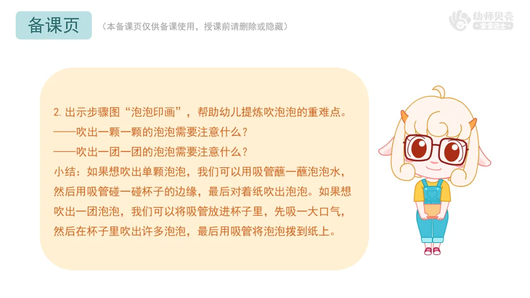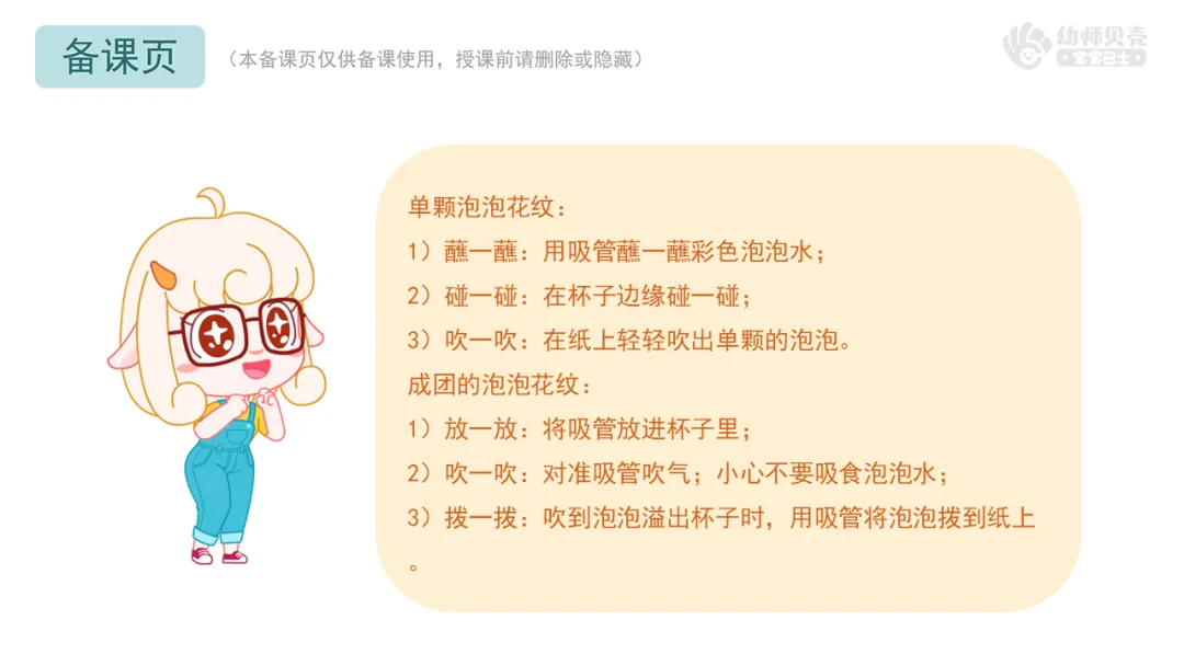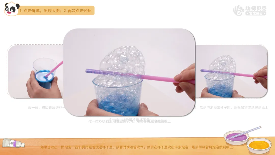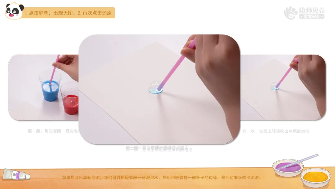 小结:如果想吹出单颗泡泡,我们可以用吸管蘸一蘸泡泡水,然后用吸管碰一碰杯子的边缘,最后对着纸吹出泡泡。如果想吹出一团泡泡,我们可以将吸管放进杯子里,先吸一大口气,然后在杯子里吹出许多泡泡,最后用吸管将泡泡拨到纸上。