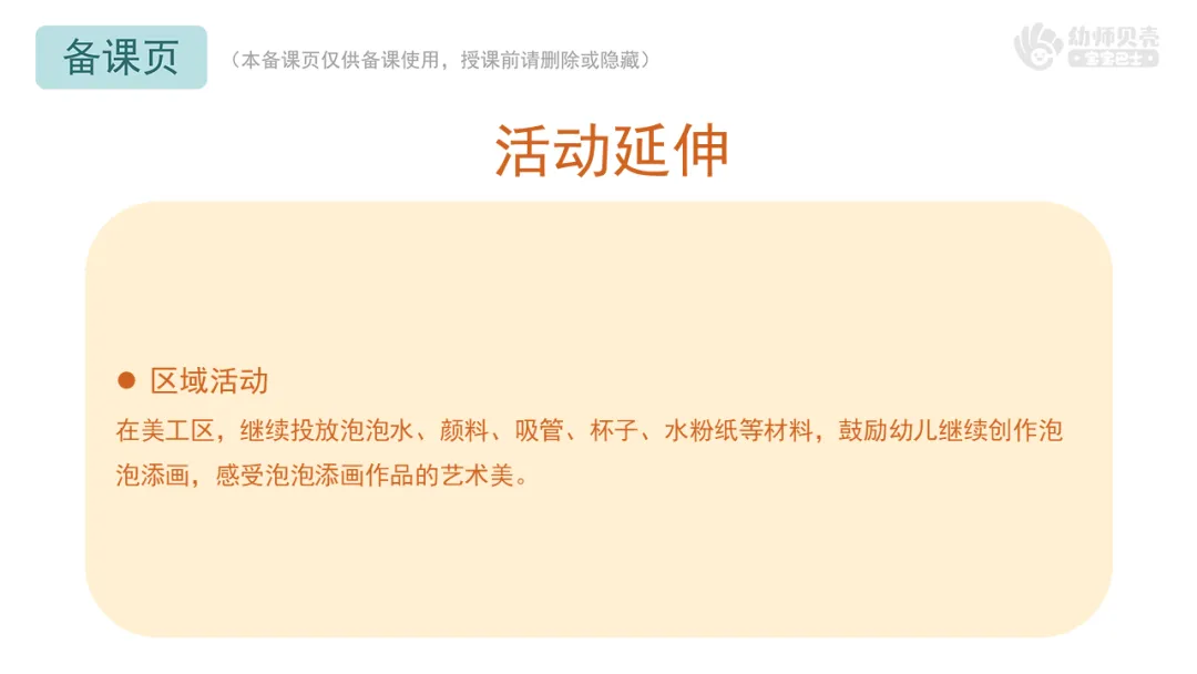 Ø活动建议:1.教师在鼓励幼儿尝试用不同颜色作画时,也要注意强调卫生安全问题,不吸食泡泡水、不使用别人的吸管等。2.提醒幼儿如果泡泡的痕迹没干添画的时候不要太用力将纸划破。