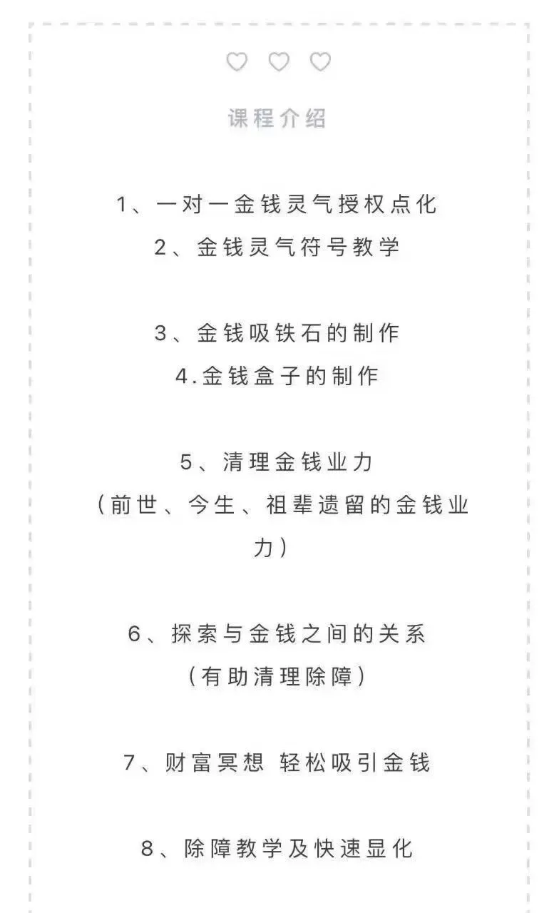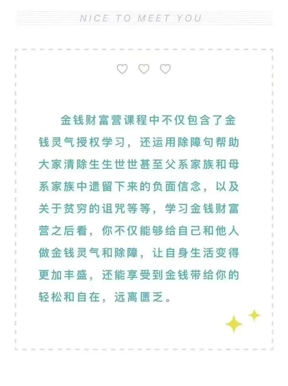 金钱财富营课程中不仅包含了金钱灵气授权学习,还运用除障句帮助大家清除生生世世甚至父系家族和母系家族中遗留下来的负面信念,以及关于贫穷的诅咒等等,学习金钱财富营之后看,你不仅能够给自己和他人做金钱灵气和除障,让自身生活变得更加丰盛,还能享受到金钱带给你的轻松和自在,远离匮乏。