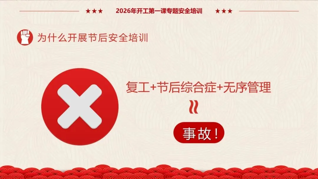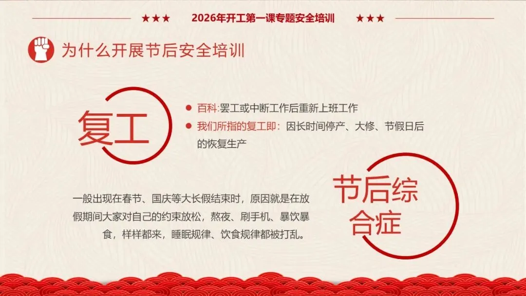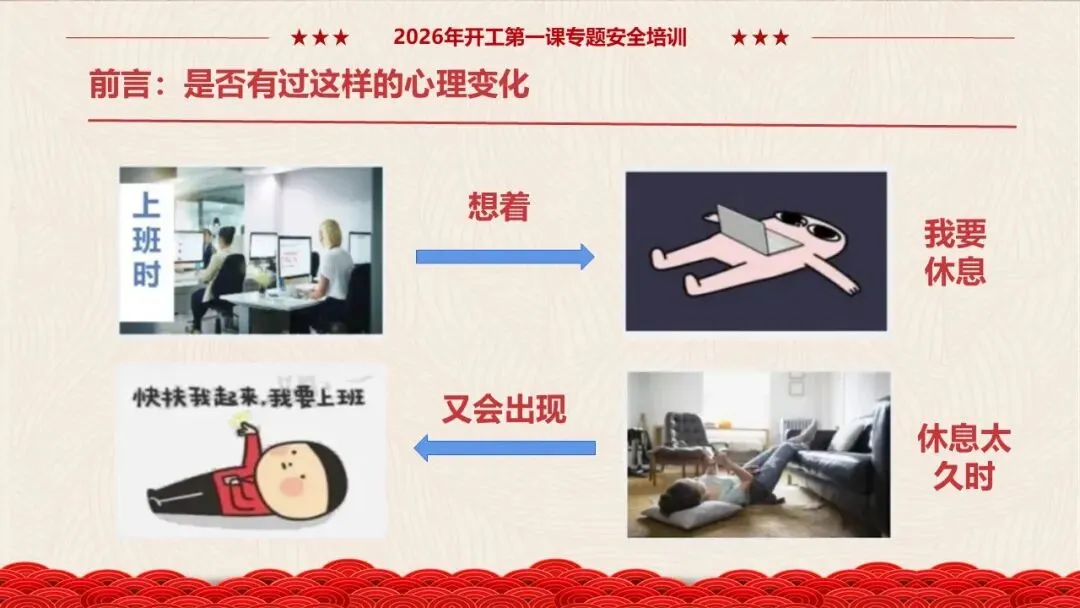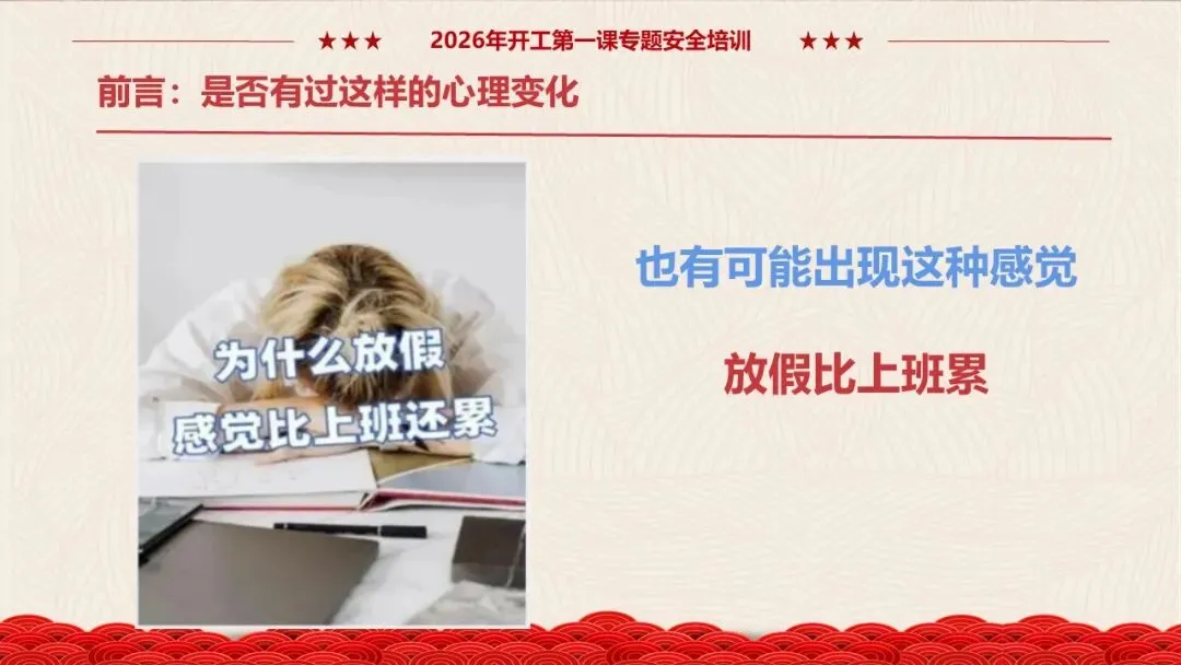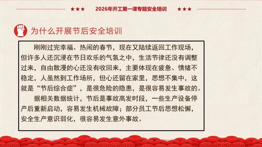 刚刚过完幸福、热闹的春节,现在又陆续返回工作现场,但许多人还沉浸在节日欢乐的气氛之中,生活节律还没有调整过来,自由散漫的心还没有收回来,主要体现在疲惫、情绪不稳定,人虽然到工作场所,但心还留在家里,思想不集中,这就是“节后综合症”,是很危险的隐患,是很容易发生事故的。