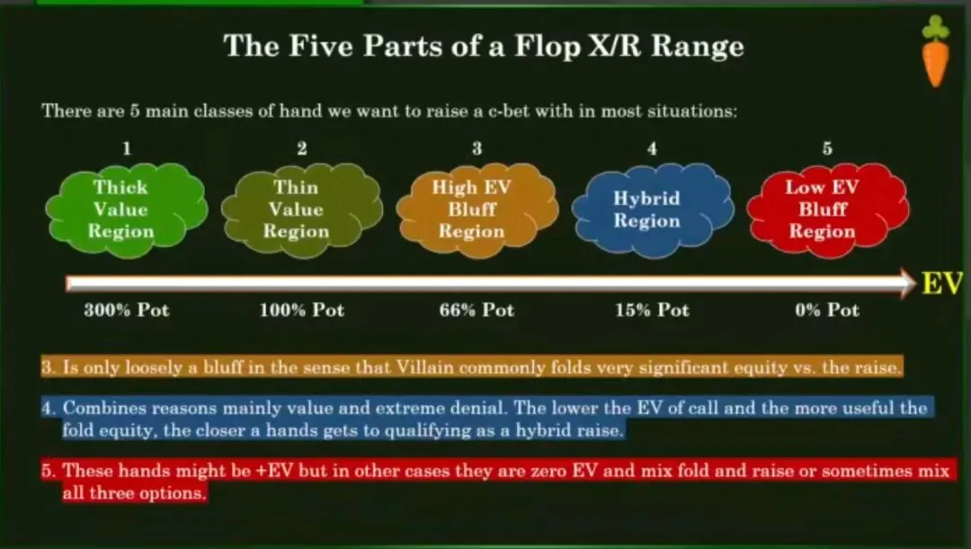 如果非要我说在我的学生群体中,关于针对翻牌圈持续下注进行加注的范围构建,我认为最常见的漏洞是什么,我会说人们可能没有足够的第二、第四或第五类牌。虽然我认为人们非常擅长加注高期望值诈唬区域和厚价值区域,我认为人们在这里错过很多薄价值下注,在这里错过很多薄价值加注,以及混合型牌——这些常常被忽略——还有低期望值诈唬,这些牌加注时感觉有点恶心,而且你很容易因为屈服于“更好诈唬谬误”而出错,你在翻牌圈拿着一些极小胜率的手牌,这手牌构成一个低期望值诈唬,比如两张高牌加一个后门同花听牌,而你决定不加注,因为你可能有更好的牌。这些并不是更好的诈唬期望值选择。高期望值诈唬和低期望值诈唬的诈唬期望值之间没有区别,意思是说加注和跟注之间的差值在每种情况下都是一样的,都是0。高期望值诈唬无论做什么都有更高的期望值,而低期望值诈唬无论做什么都有更低的期望值,但这不是优先选择第三组而不是第五组的理由,你应该在你的每个范围(跟注和加注)中都拥有两者。对于第五组,它们的期望值通常非常接近,以至于接近0期望值,在这些情况下,我们甚至可能会混合跟注、弃牌和加注,或者甚至只是在手牌没有足够的稳健性来跟注时,在加注和弃牌之间混合。我们有这样一个粗略的尺度来衡量这些手牌有权获得多少底池。这当然不是指胜率,而是指期望值。我们不会有胜率300%的手牌,那是不可能的,但一个厚价值区域的手牌很容易有权获得一个最初很小、未来可能变得大得多的底池的300%。非常重要的是要注意到,我们不会因为我们的低期望值诈唬和混合型牌对底池没有很多权益而感到不安。我们不想成为我们在一年级讨论过的“线性化陷阱”的受害者,即仅仅从上往下加注,所以一定要记得在你的范围中包含这些底牌。