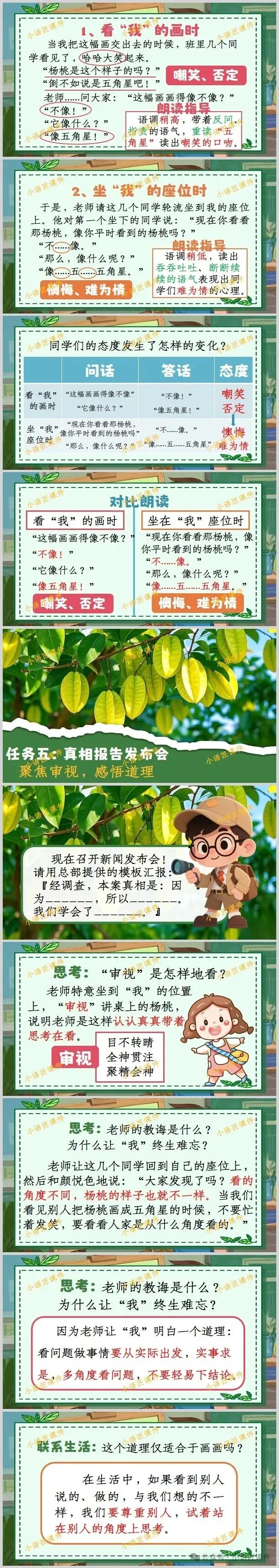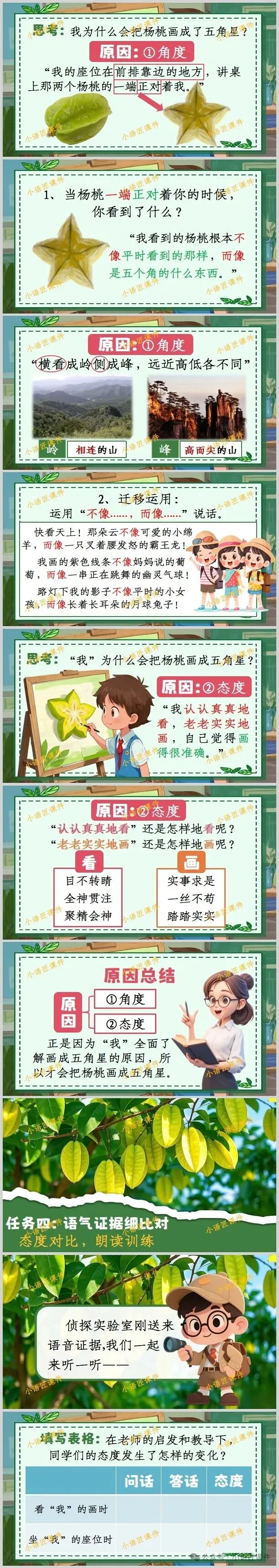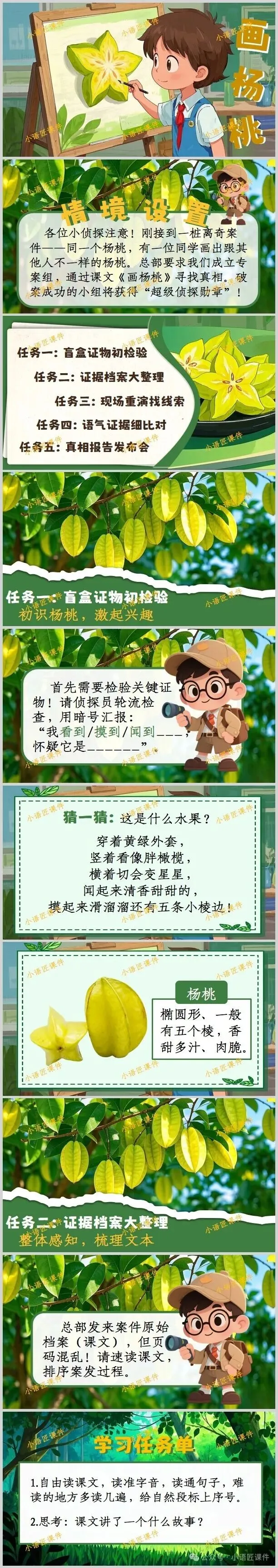 【二下课件】情景设置:“小侦探破案记:为什么同一个杨桃大家画得不一样?”——《画杨桃》(+教学设计!)