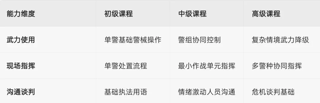 我们需要构建 “警务实战训练的能力图谱课程体系” ,而不是规定每堂课必须“先讲10分钟理论,再示范5分钟”的所谓“标准流程”。例如建立一个清晰的 “能力-课程”映射矩阵: