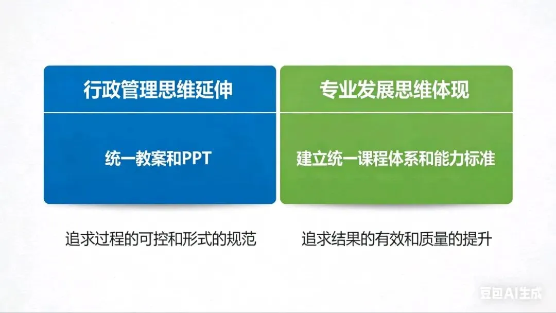 要求统一教案和PPT,是行政管理思维的延伸——它追求的是过程的可控和形式的规范。而建立统一的课程体系和能力标准,是专业发展思维的体现——它追求的是结果的有效和质量的提升。