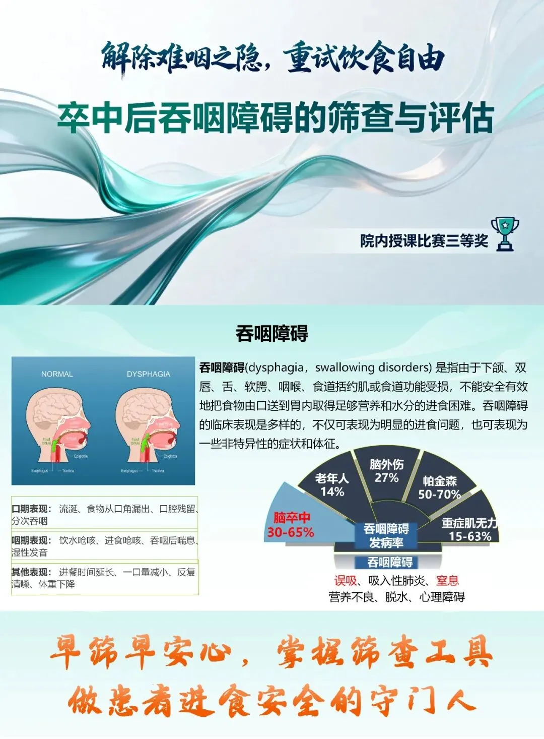 今天,我们结合一份获得院内授课比赛三等奖的查房资料,为大家拆解卒中后吞咽障碍的全流程筛查与评估。无论你是刚入行的新护士,还是科室的带教老师,这份“床旁决策路径”都能帮你精准避坑。