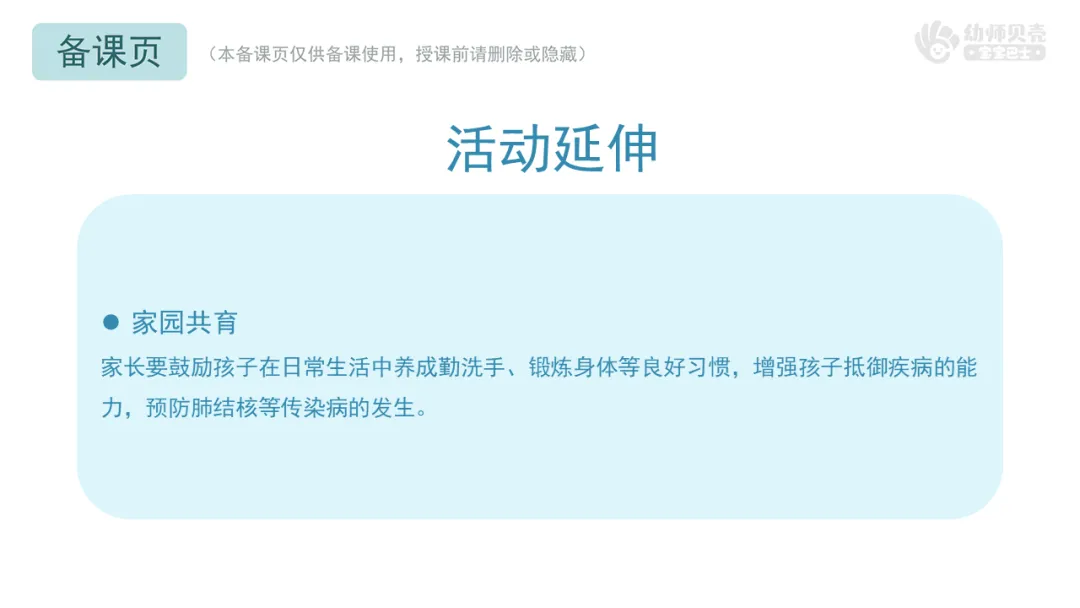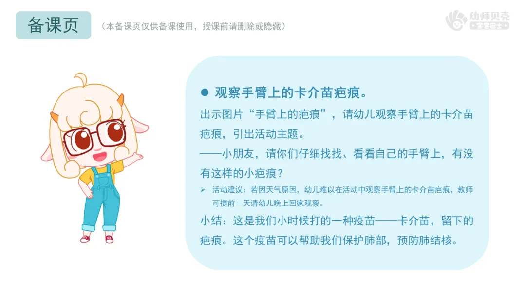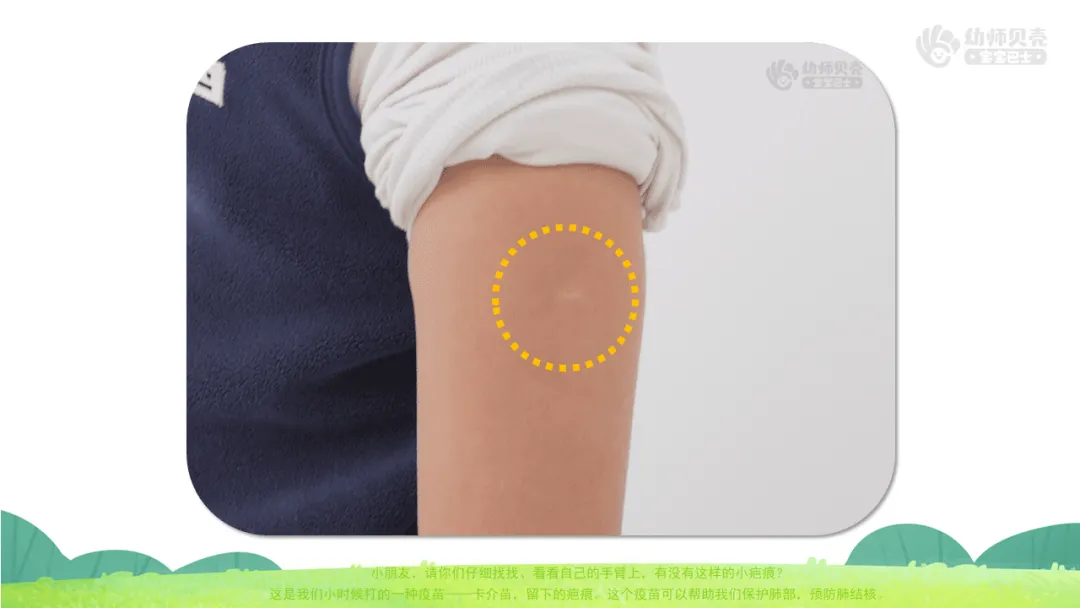 Ø活动建议:若因天气原因,幼儿难以在活动中观察手臂上的卡介苗疤痕,教师可提前一天请幼儿晚上回家观察。