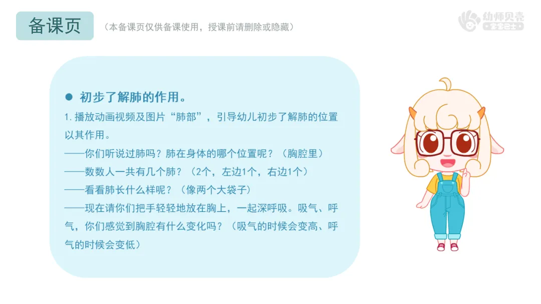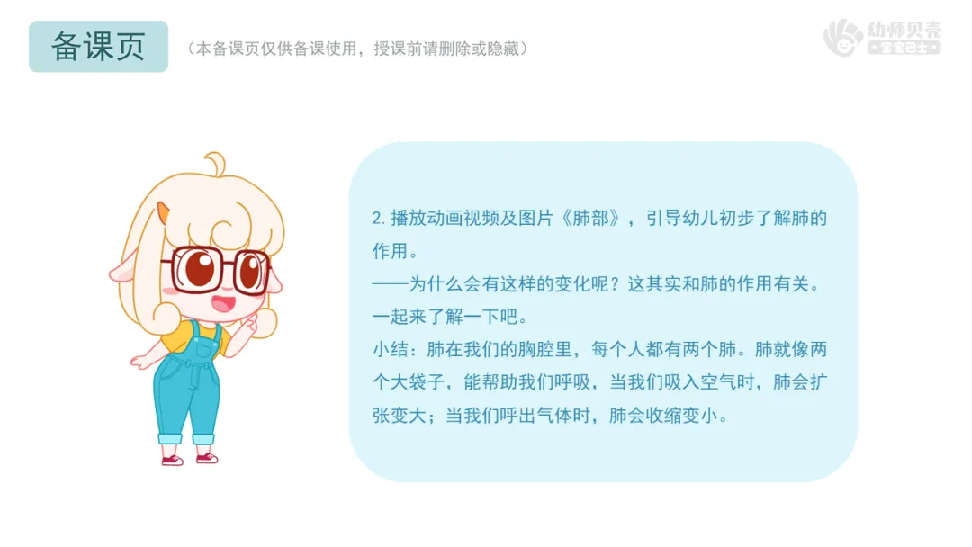 ——现在请你们把手轻轻地放在胸上,一起深呼吸。吸气、呼气,你们感觉到胸腔有什么变化吗?(吸气的时候会变高、呼气的时候会变低)