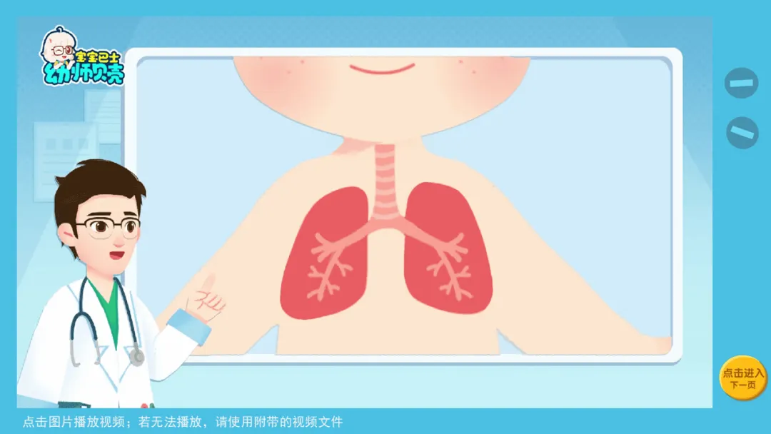 播放动画视频及图片“肺部”,引导幼儿初步了解肺的位置以其作用。