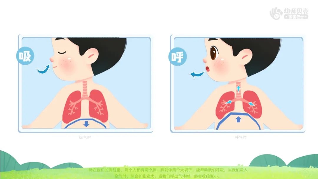 小结:肺在我们的胸腔里,每个人都有两个肺。肺就像两个大袋子,能帮助我们呼吸,当我们吸入空气时,肺会扩张变大;当我们呼出气体时,肺会收缩变小。
