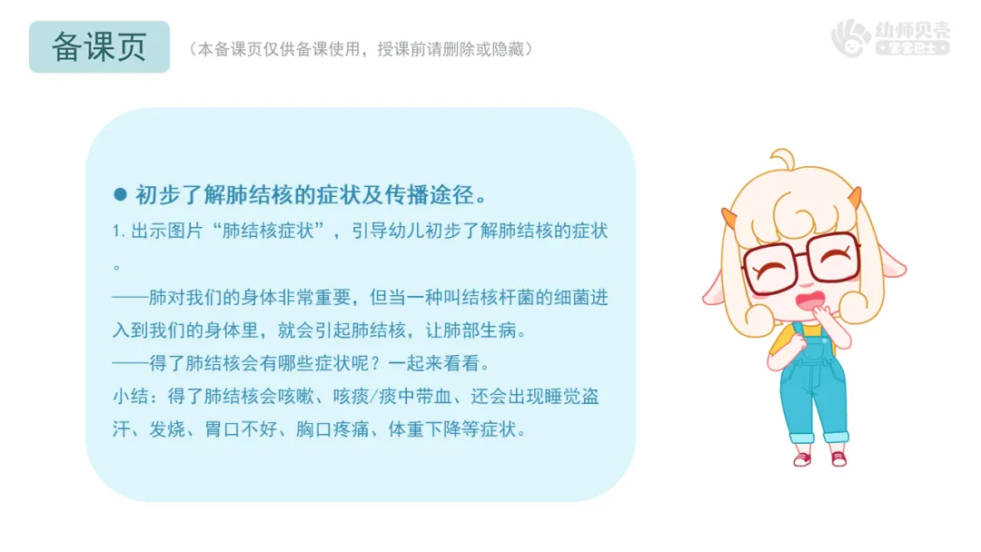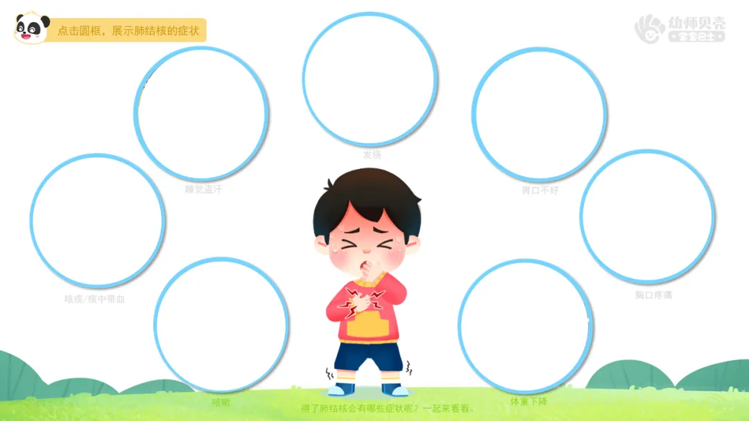 1.出示图片“肺结核症状”,引导幼儿初步了解肺结核的症状。