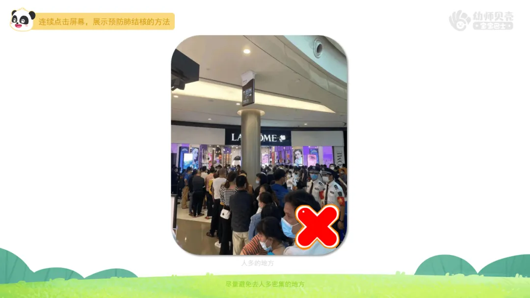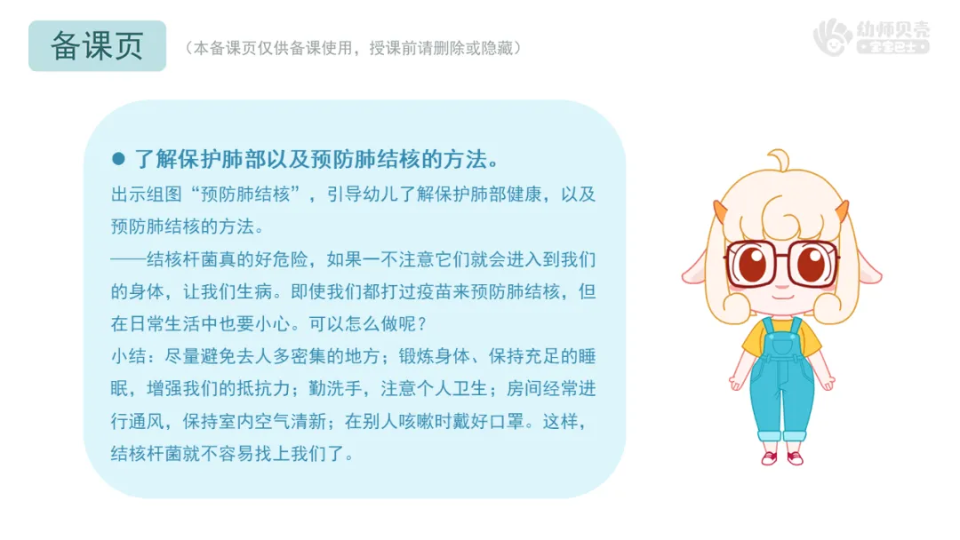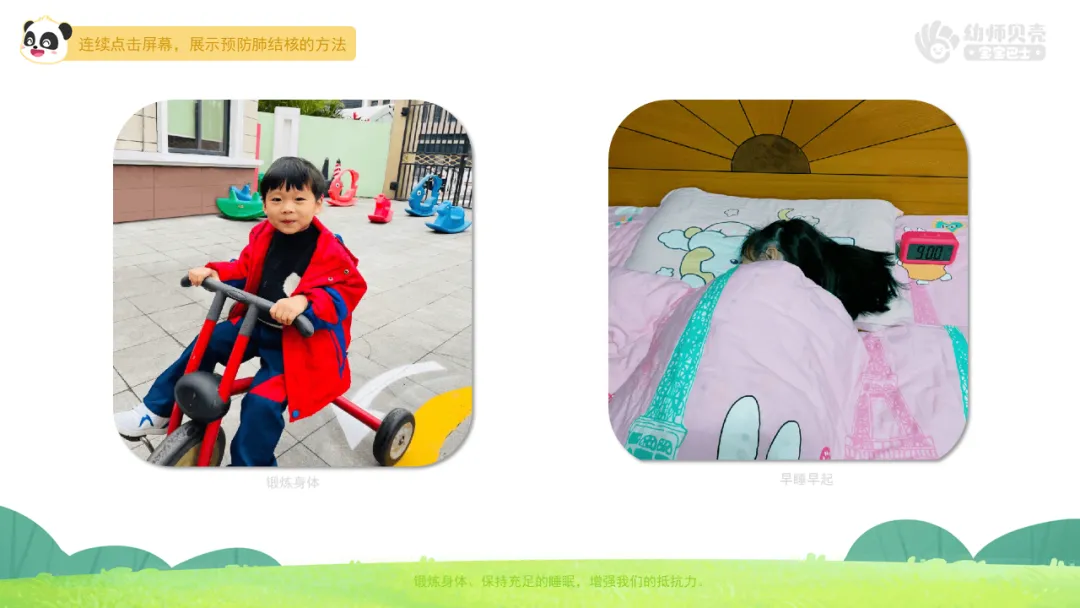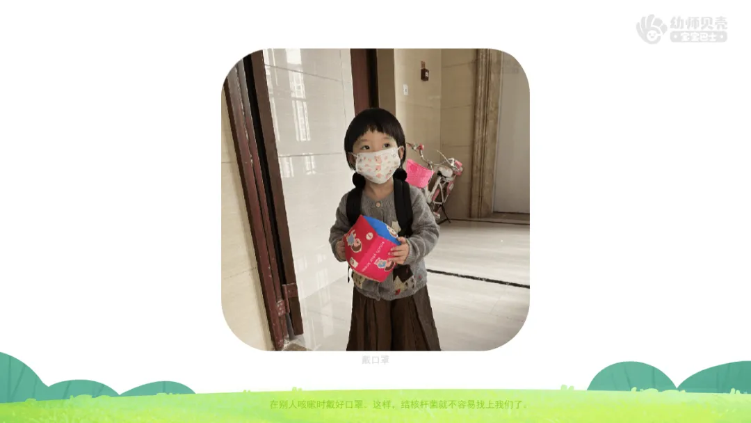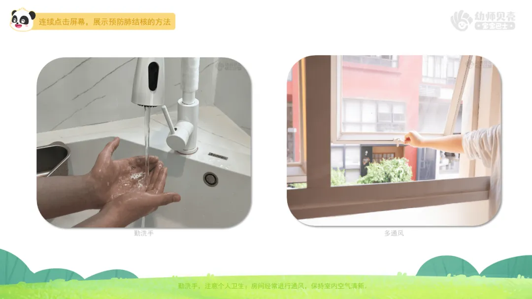 出示组图“预防肺结核”,引导幼儿了解保护肺部健康,以及预防肺结核的方法。