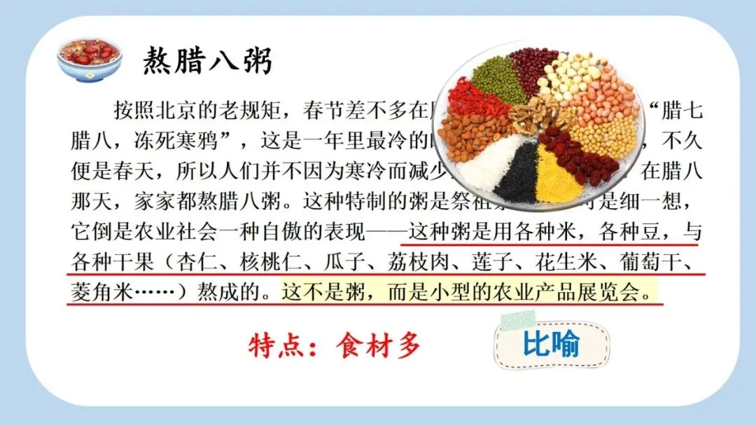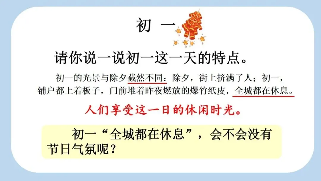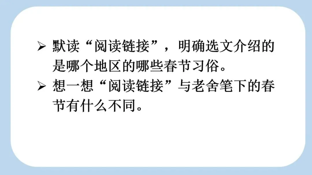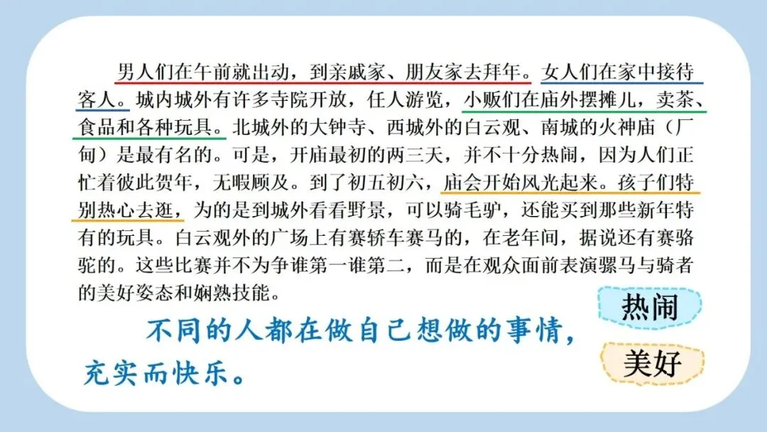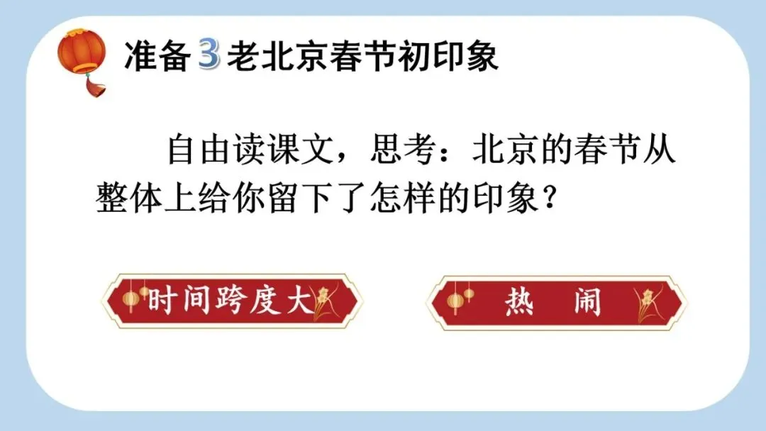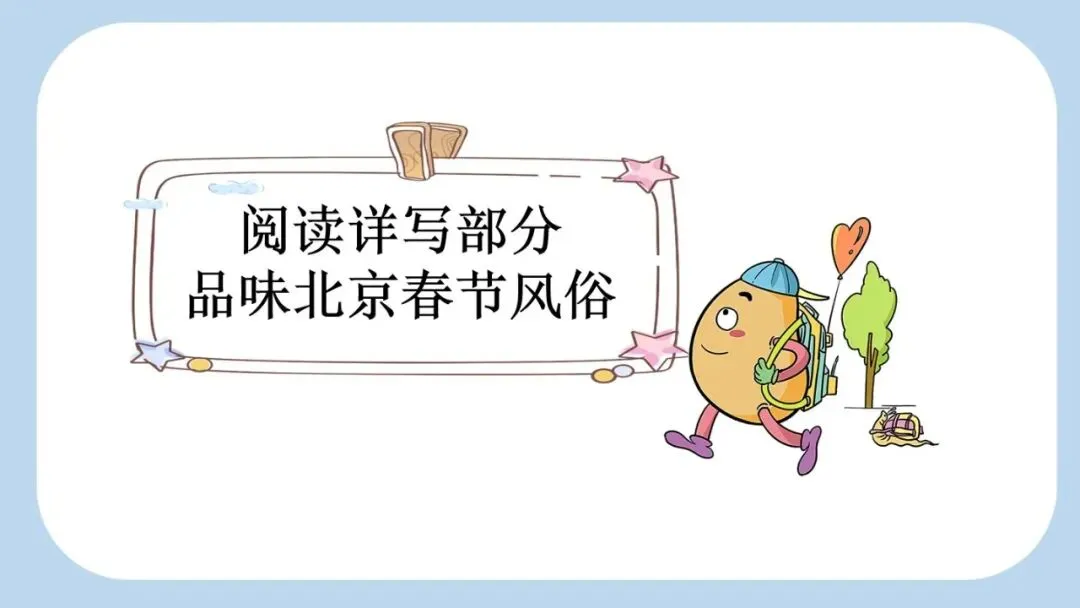 “腊七腊八,冻死寒鸦”,可老舍先生笔下的北京春节,却热火朝天。当除夕的鞭炮声响起,当家家户户拿出炖肉的铛,那股热闹劲儿就顺着纸墨,钻进了孩子们的心里。这个春天,邀您和孩子们一起,穿行在那条飘满粥香的胡同里,循着文字品味最地道的京味儿年俗。 从腊八的粥香到元宵的灯影,老舍先生笔下的年味,就在这一篇《北京的春节》里。想带孩子品出文字背后的民俗画卷吗?这套课件已为您一站式备齐——不只讲字词,更带学生透过文字,读懂老北京的人情冷暖与文化温度。