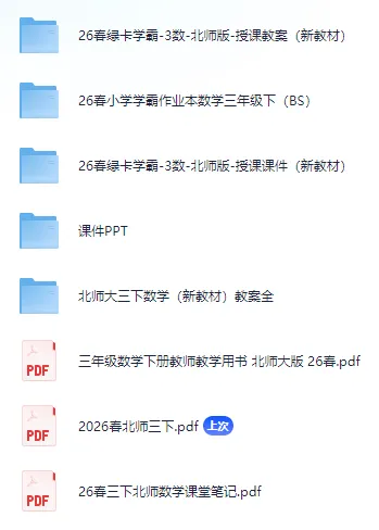 本文收集的教学资源是2026春新北师大版三年级数学下册课件教案+预习单+课本答案+教辅+专项训练+学霸笔记+教师用书+检测试卷习题+作业设计最新优质资源,全部存放于网盘,网盘部分资源截图如下: