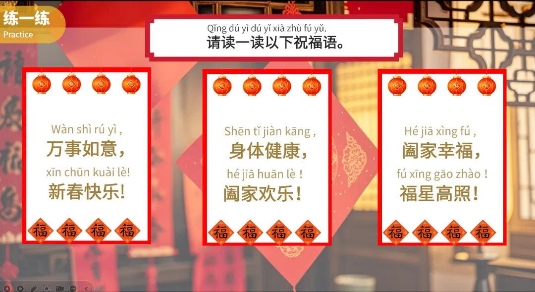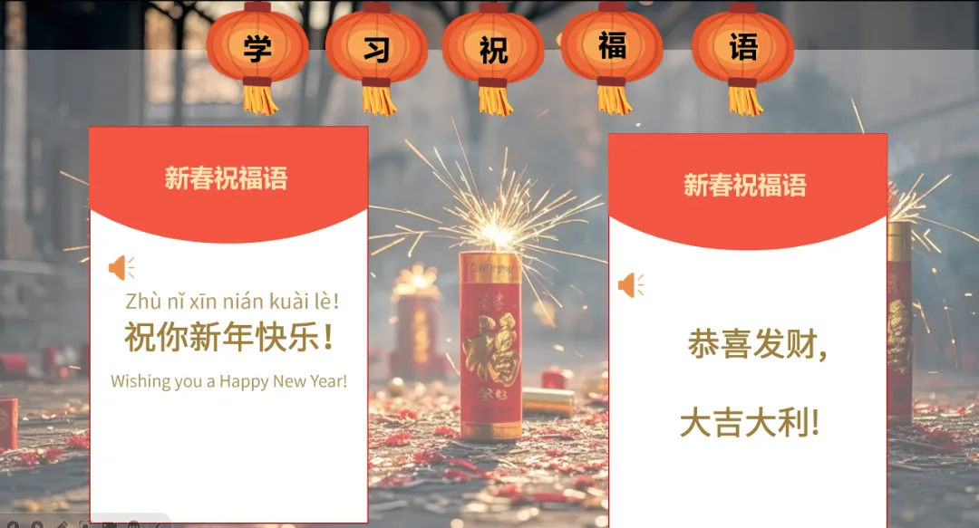 春节是传递祝福的时刻,课件中专门设置了学习新春祝福语的环节。