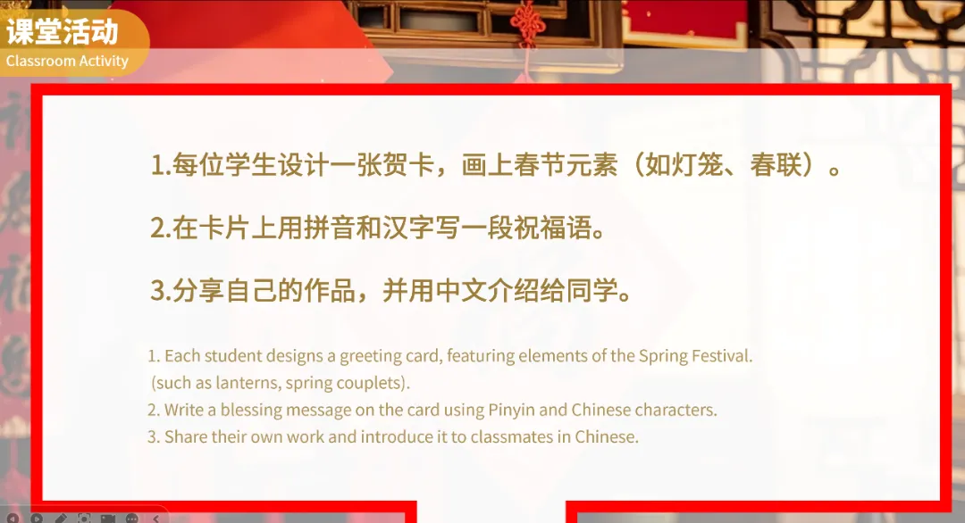 学生们可以亲手设计贺卡,画上灯笼、春联等春节元素,并用拼音和汉字写下祝福语,然后分享自己的作品并用中文介绍。