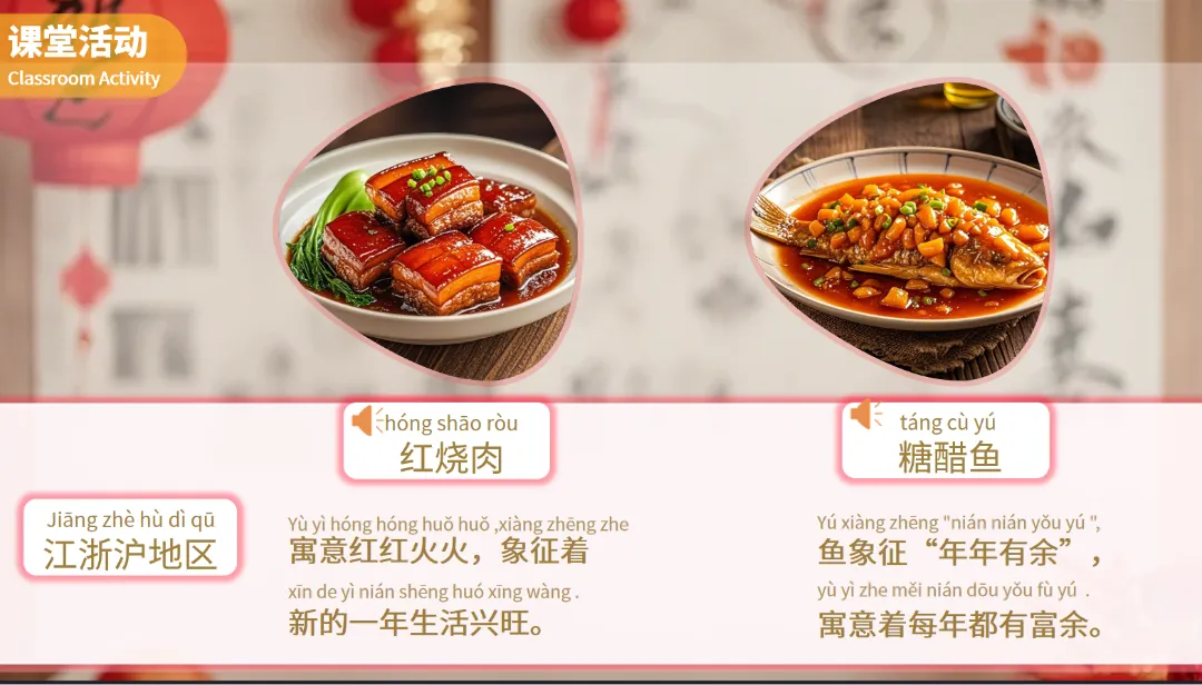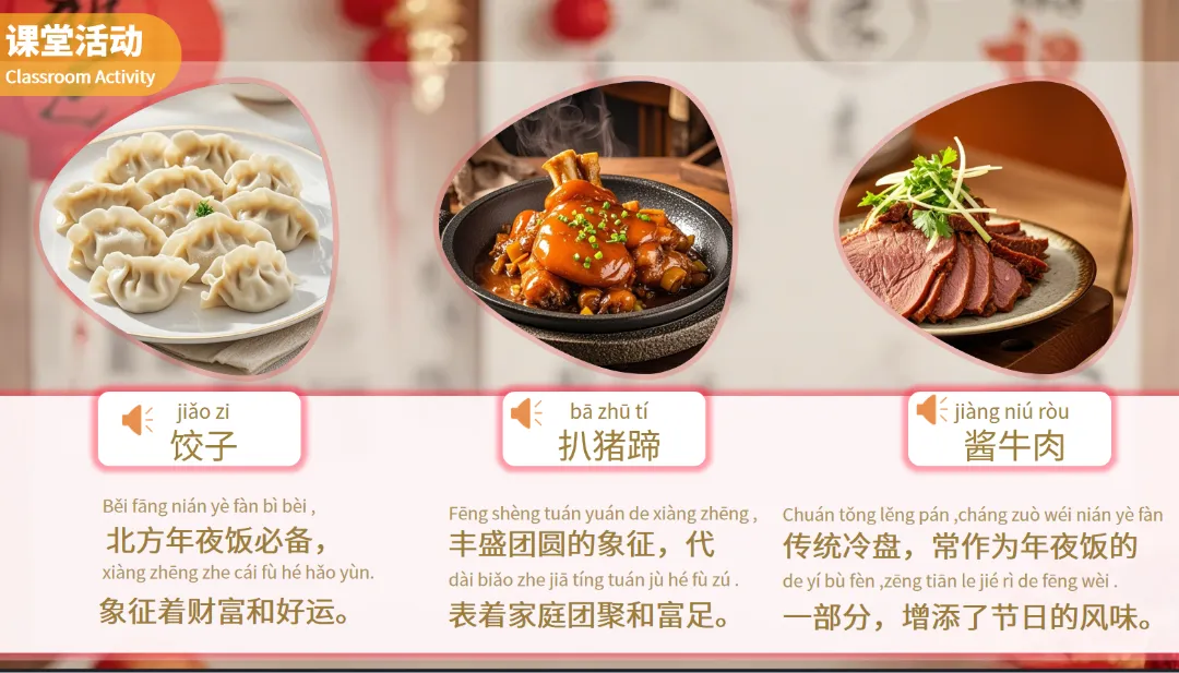 此外,还介绍了北方和南方春节的传统美食,如饺子、扒猪蹄、酱牛肉、红烧肉和糖醋鱼等,让学生了解不同地区的饮食文化。