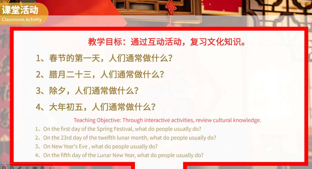 为了让学生更深入地体验春节文化,课件设计了丰富的课堂活动。