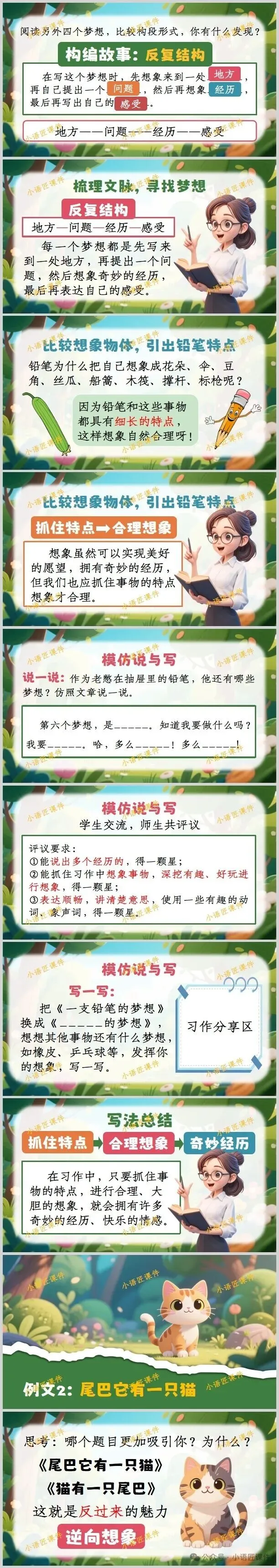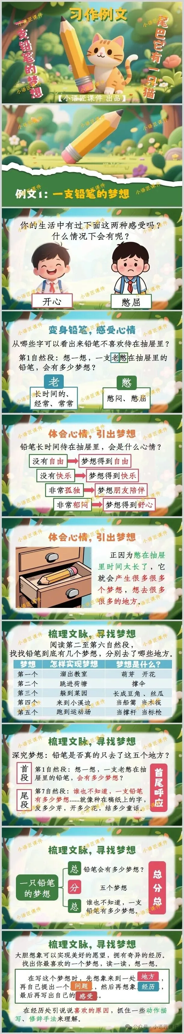 今天给大家分享的是部编人教版三年级下册习作例文《一支铅笔的梦想》和《尾巴它有一只猫》的独家课件。