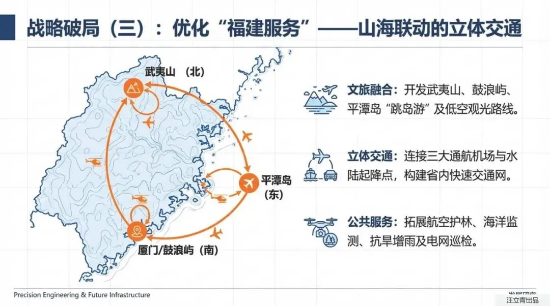 未来的福建乃至全国,低空经济将展现出令人惊叹的蓝图。我们不仅要划出120米以下的“空中智慧道路”,让无人机有专属的航道,还要利用数字福建的优势,给天空装上“红绿灯”和“数字地图”。未来的应用场景会非常接地气:你可以坐着直升机鸟瞰武夷山、鼓浪屿或平潭岛,享受一场“说走就走”的空中旅行;在森林防火、电力巡检甚至是海洋监测等危险活儿上,无人机会成为最靠谱的“特种兵”。针对福建山多地少的特点,我们还会研发出更耐操、能适应恶劣天气的智能化飞行器,打造出响亮的“福建名牌”。当低空经济与短视频、社交媒体营销深度绑定,大众的需求被彻底点燃时,这片天空将不再寂静,而是一个充满无限可能、连接你我生活的新维度。