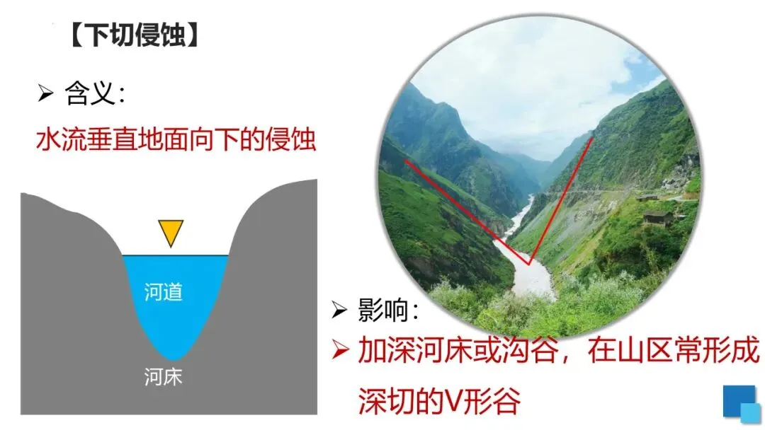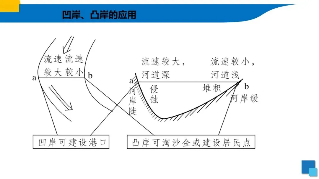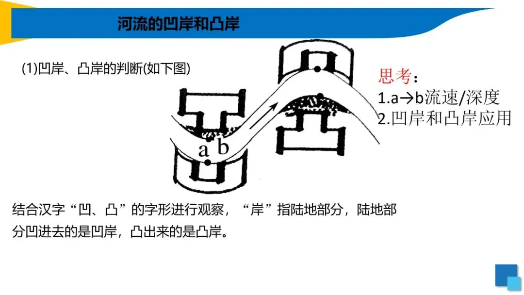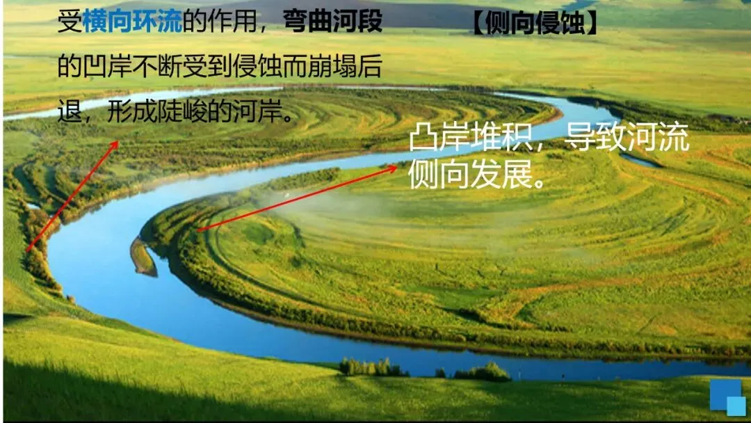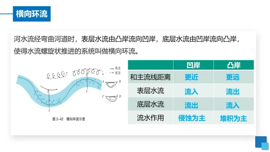 【点睛】河流流经弯道时,水流做曲线运动产生离心力。 在离心力的作用下,表层水流趋向凹岸,冲刷凹岸,使凹岸水面略高于凸岸,因此,底部的水流在压力的作用下,由凹岸流向凸岸,形成弯道环流,在弯道环流的作用下,凹岸发生侵蚀,凸岸发生堆积。