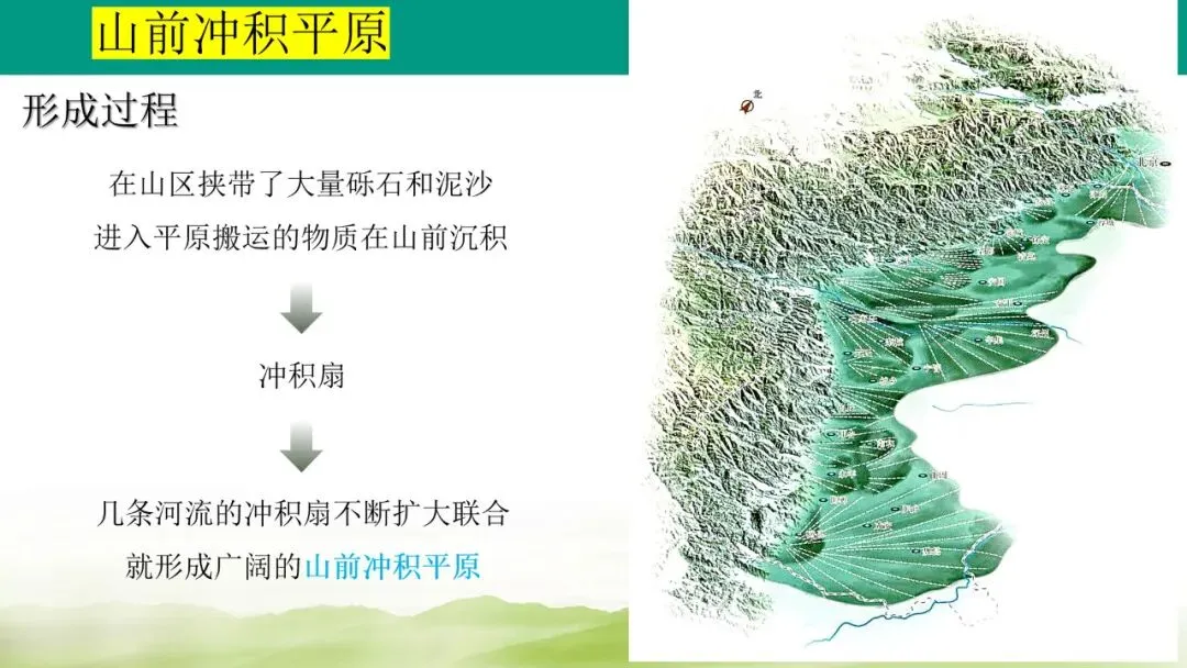 【详解】(1)冲积扇是河流挟带泥沙堆积形成的,沉积物较为疏松,易被侵蚀;冲积扇地形较为平坦,在河流侧蚀作用下,河流易摆动改道,发育阶地的空间大;结合图中山地边界位置可知该冲积扇(东、北、西)三面环山,汇水面积大,河流流量大,流水作用强,在河流流经山区时,挟带的泥沙量大,在冲积扇发生堆积时,堆积的泥沙量也大,因此冲积扇堆积物深厚,为下切出多级阶地提供垂向空间。