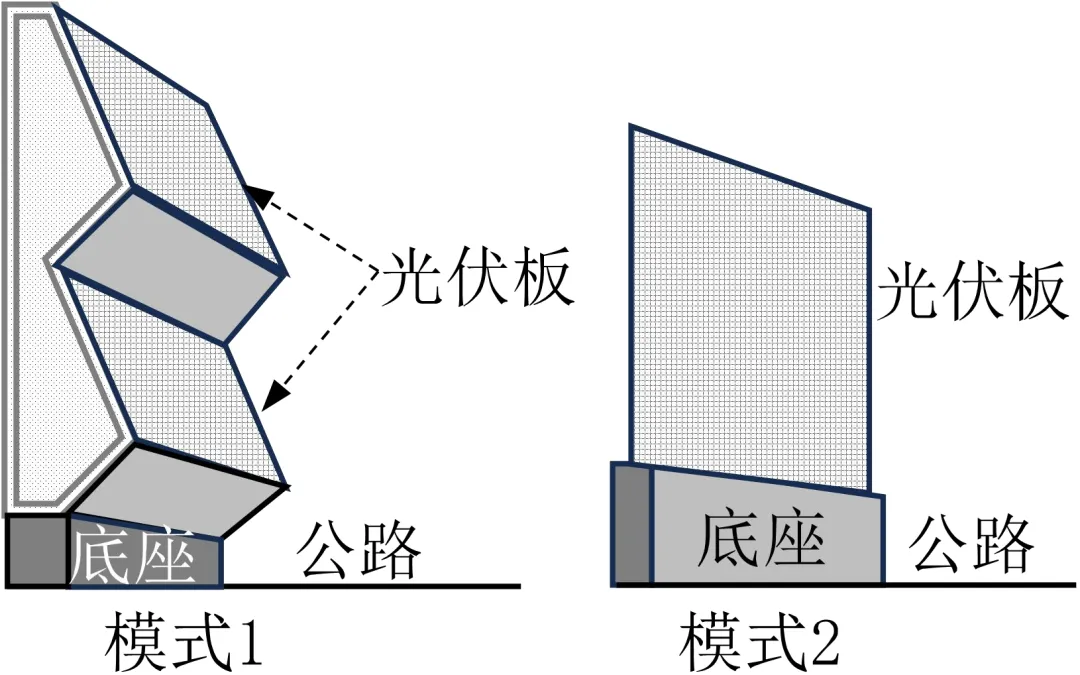 光伏道路隔音屏障是将城市道路隔音屏障和光伏发电技术相结合,利用光伏组件将太阳能转化为电能的一种应用形式。如图示意光伏组件与道路隔音屏障的两种不同结合方式,完成下面小题。
