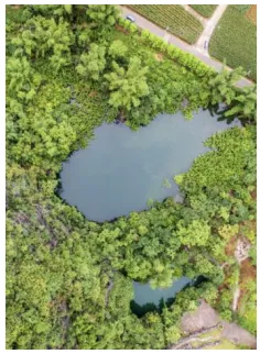 我国南方喀斯特地区某地下河流域拥有多处天窗与地表水系相连。根据天窗的主要水流方向,该地下河流域的天窗包括灌水天窗(地表→地下)、涌水天窗(地下→地表)、静水天窗。流域内部分天窗已开发为旅游景点,夏季游客选择涌水天窗戏水。如图为该地下河流域某天窗航拍景观。完成下面小题。