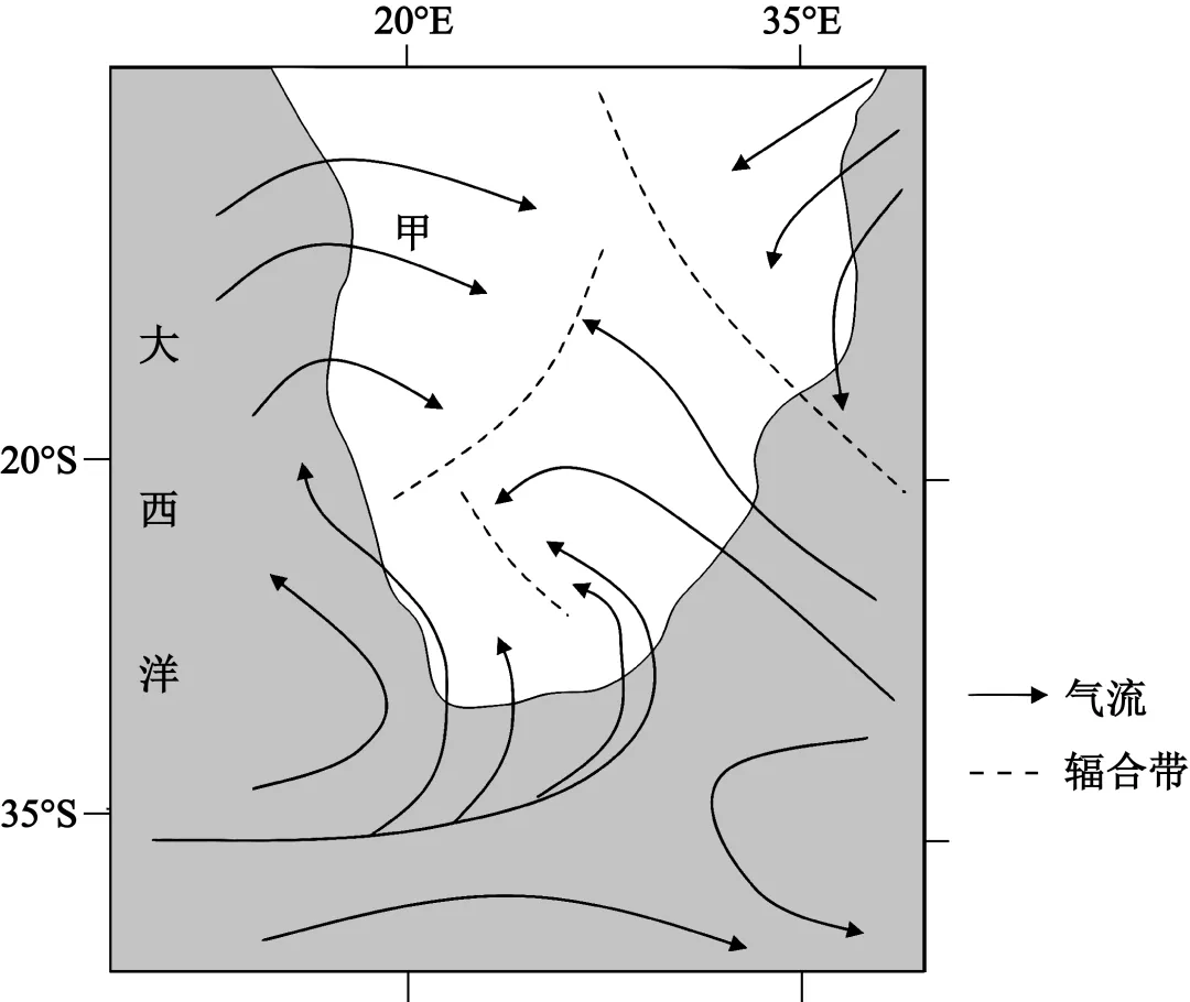 非洲南部夏季大气环流形势复杂,多股气流交汇,显著影响地带性气候格局。如图示意1月非洲南部典型大气环流形势。完成下面小题。