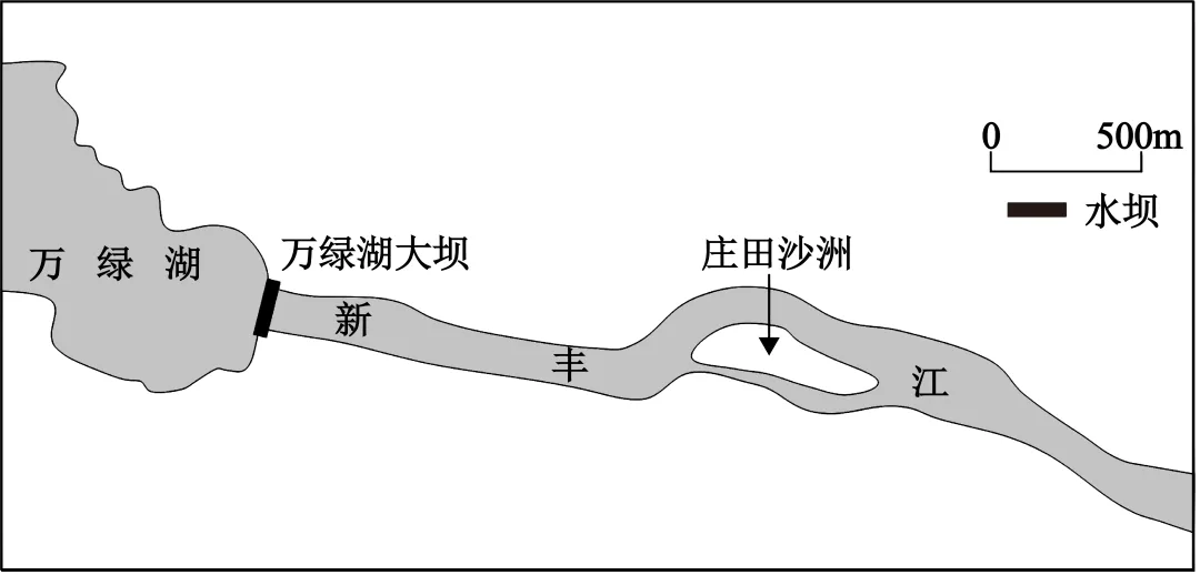 通常情况下,建坝后大坝上游流速减慢,泥沙淤积,下游流速加快,冲刷加剧。广东万绿湖大坝下游1.4千米处却发育庄田沙洲(下图)。历史上,庄田沙洲是水下浅滩,大坝建成之后逐渐形成沙洲。由于侵蚀能力有限,沙洲能够保持相对稳定。完成下面小题。