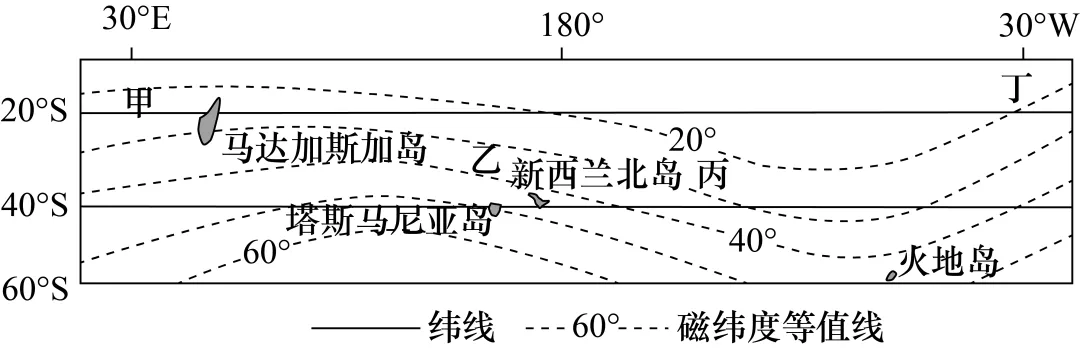 南北磁极与地球南北极点不重合,磁纬度用于衡量当地与南北磁极的远近(地磁南北极的磁纬度为90°)。2024年5月10日-12日,地磁场发生大规模磁暴。北京时间5月11日6时,摄影爱好者小珂在火地岛拍摄到极光。如图示意南半球部分岛屿磁纬度分布。完成下面小题。