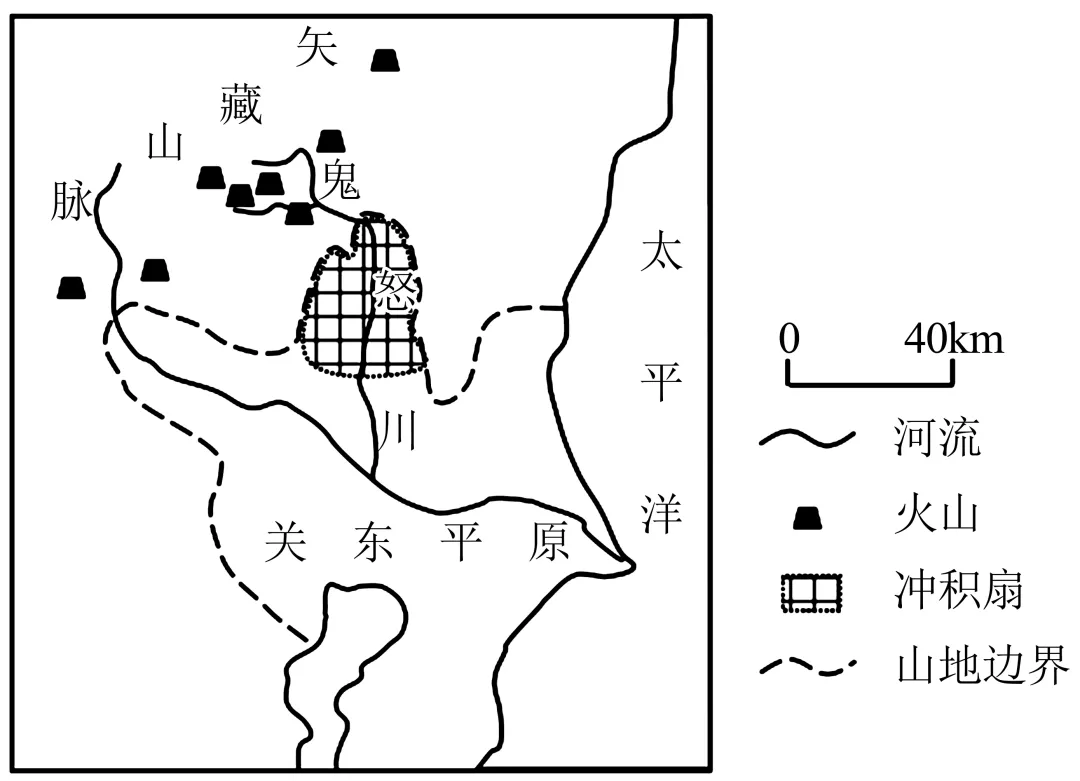 日本鬼怒川源于矢藏山脉,向南流入关东平原,流域内年平均降水量1500-2000毫米。鬼怒川出山口冲积扇河段发育10级阶地,成因各异,被誉为河流阶地的缩影博物馆。其中,个别阶地的形成是由河流对堵河熔岩下切形成,该类阶地在其他地区较为罕见。如图示意鬼怒川流域的地貌和水系。
