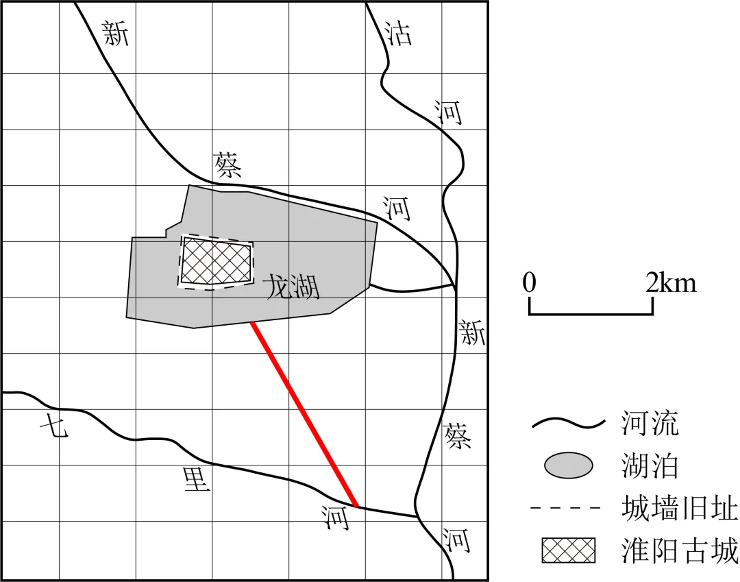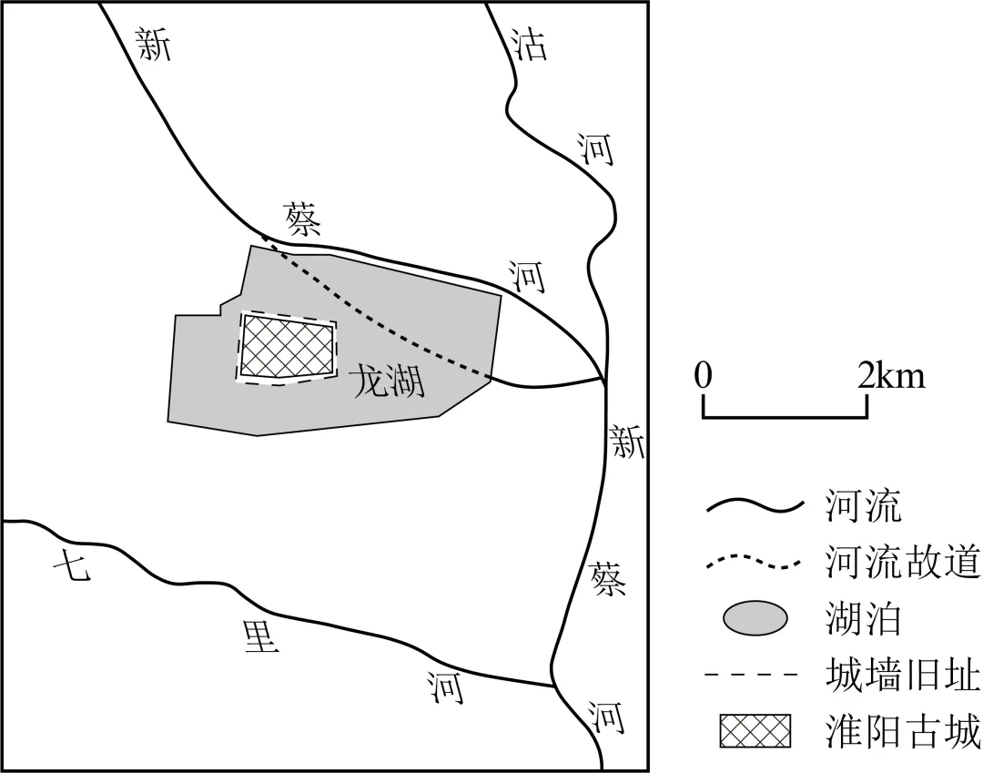 淮阳古城始建于西周时期,城墙外有郭城(都城的外围居民区)。唐朝,受黄河泛滥的影响,郭城废弃,古人在原郭城外围垒筑护城堤,以成为淮阳古城的二道防线,但仍时有局部冲垮的现象。护城堤建成后,堤内和城墙之间逐渐积水形成龙湖。北宋时期,为优化淮阳古城周边水系形态,古人通过人工改道使得汴京四大漕运河道之一的新蔡河独立于龙湖水系。20世纪,为保障淮阳古城防洪安全,人们开凿了流向七里河的泄洪通道。淮阳古城城湖共生的空间格局,完整地展现了筑城三千年来,淮阳人民应对黄河泛滥、改善城址环境的营城智慧。如图示意淮阳古城位置及周边水系。